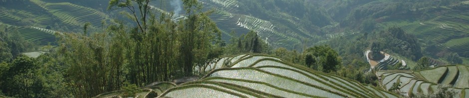 Et puis, le moment béni : en après-midi, nous sommes allés voir d’autres rizières en terrasses encore plus impressionnantes que celles du matin si c’est possible. Ces terrasses s’étendent sur des montagnes de 3000 mètres, entre environ 2200 et 1000 mètres, soit le fond des vallées. Elles datent de 2000 ans et elles sculptent les montagnes; les Hani les ont construites et continuent de les travailler. Tout se fait à la main, ou avec des bœufs pour le labour de profondeur. Hommes et femmes y travaillent d’arrache pied, même si les jeunes semblent peu présents.