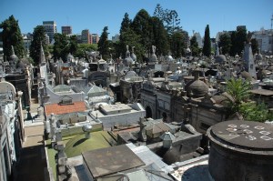 Levés frais et dispos; merci encore au tout petit décalage… Mais Marie a dû travailler pendant près de 3 heures cet avant-midi; le PC et le Wifi, ce n’est pas toujours très agréable. Visite du Cimetière de la Recoleta: une orgie de monuments funéraires extravagants. Les richissimes porteňos de bonnes familles, parmi lesquels une foule de militaires morst évidemment pour la patrie, souvent assez vieux dont un en 1931 à l’âge de 100 ans; je gagerais qu’il a courageusement survécu 75 ans à tous ses troupions. A côté de ces monuments impressionnants, celui où est enterré Évita semble humble, perdu d’ailleurs parmi une foule d’autres de la même sobriété. Pour ceux qui ont lu « Santa Evita » de Tomás Eloy Martínez, on comprend; on voulait éviter sa sanctification politique… Dîner dans le coin dans un café cher, mais avec une terrasse sous un arbre immense; une folie de début de voyage. Visite de la lbrairie El Ateneo Grand Splendid dans un vieux cinéma, avec aussi un très joli café: la plus grande du monde, la FNAC et Renaud-Bray peuvent aller se rasseoir.