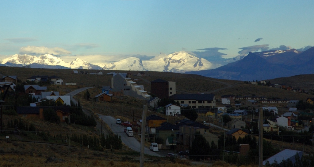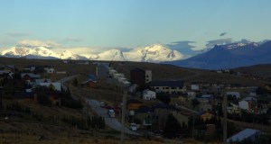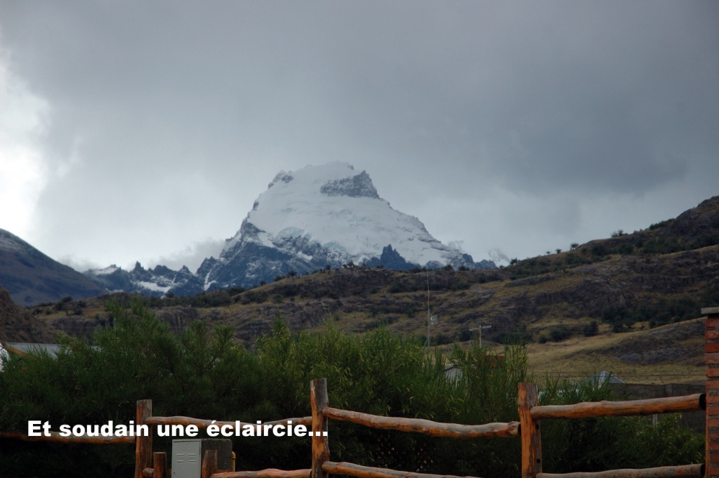 Et l’éclaircie en début d’après-midi où nous découvrons finalement un petit village entouré de grands pics enneigés; un instant nous croyons voir le Cerro Torre, où le Cerro Fritz Roy, les vedettes du coins. Mais non, ce sont seulement d’illustres inconnus comme le Cerro Solo; mais, notre déception n’est pas réelle, car le paysage est magnifique, surtout vu de deux collines (de quelques centaines de mètres tout de même) qui surplombent la ville et que nous avons escaladées bravement. Plus haut, j’ai poursuivi seul et bénéficié d’un panorama englobant le désert de la Patagonie qui s’étend à l’est de la Cordilière des Andes. Magnifique excursion entre le beau temps et la pluie. Chanceux tout de même…
