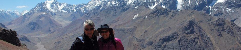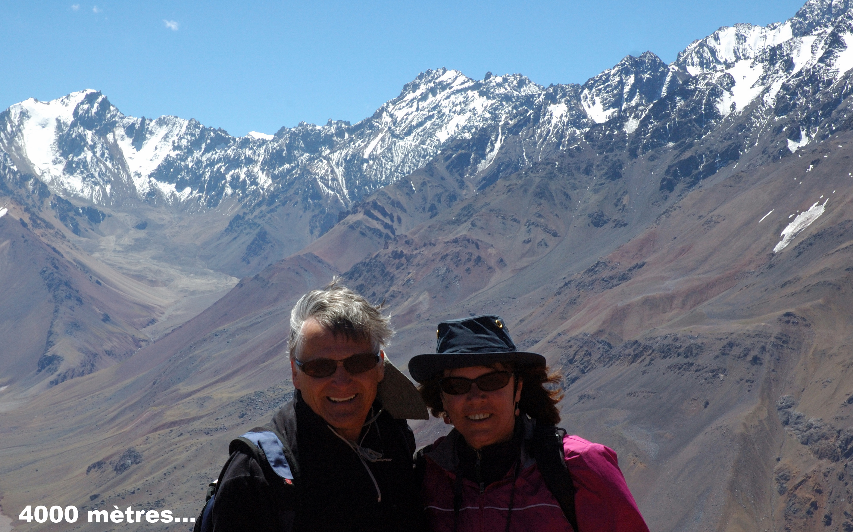 sommet de l’Aconcagua ; impressionnant, mais ne voir que le sommet l’est moins que de voir toute la montagne comme nous en avons fait l’expérience avec le Tronador. Mais pour le voir en entier, il faut faire un trek de deux jours au moins, et nous n’en avons peut-être pas la forme physique nécessaire. Mais nous nous comptons privilégiés d’avoir vu le plus sommet des Amériques après celui de l’Amérique du Nord (McKinley 6200 mètres), celui d’Europe (Mont Blanc), d’Afrique (Kilimandjaro) et d’Asie (l’Everest en décollant de Katmandou et l’Annapurna de notre hôtel à Pokhara). Et toujours aussi impressionnés, écrasés par cette grandeur..