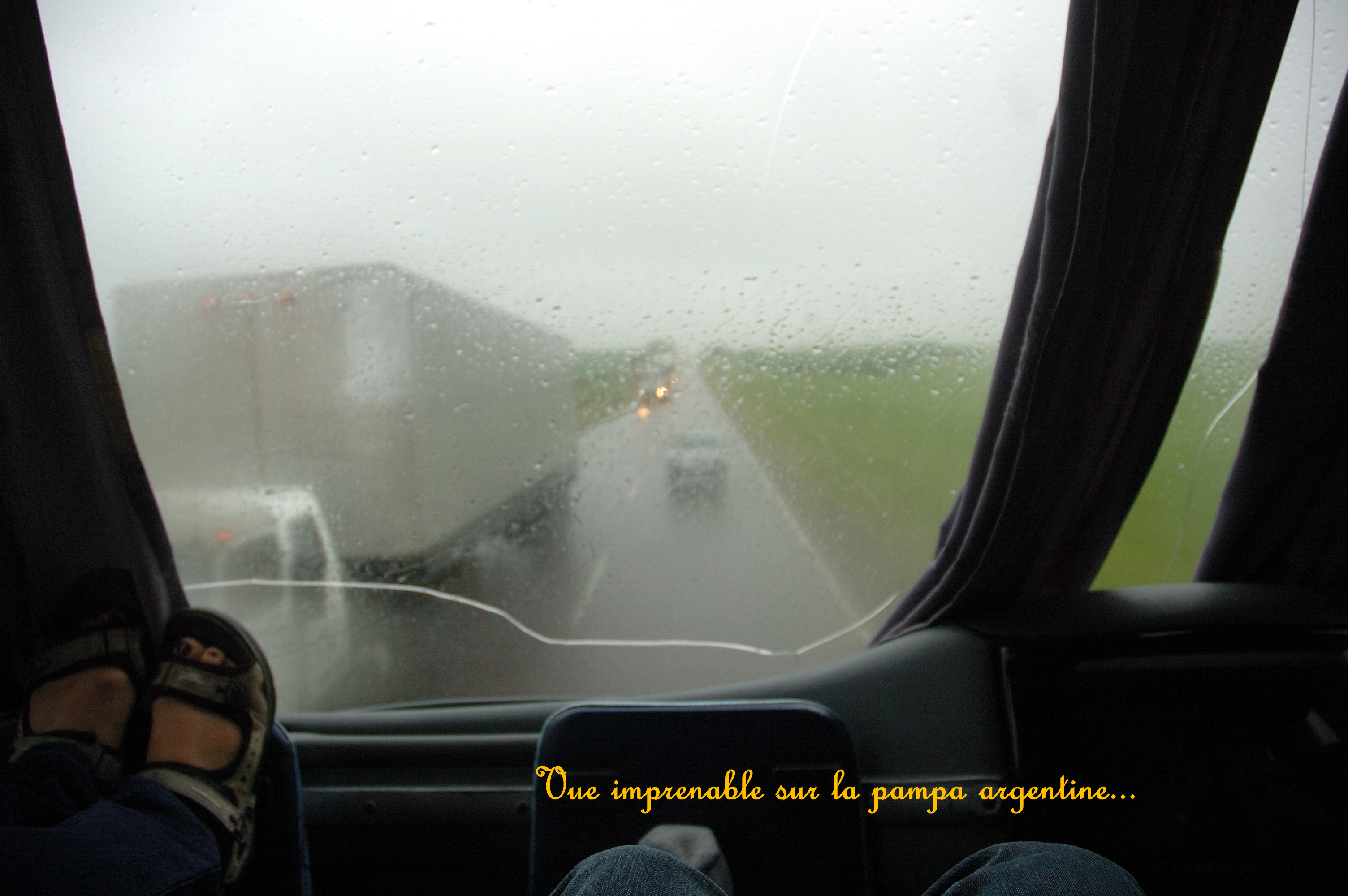 qui nous avait pourtant été référée par le bureau d’information du terminal d’autobus. Évidemment, nous avons eu l’avantage d’être à la première rangée de sièges, au deuxième étage de l’autobus, et nous avons donc bénéficié d’une vue imprenable… sur la pluie qui tombe toute la journée sur la pampa très fertile de la région. Plat, ennuyant, et nous visitons tous les terminaux d’autobus des innombrables petites villes qui sillonnent le parcours.