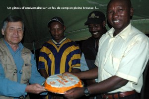 Il me faut quand même souligner un évènement assez particulier qui s’est produit pendant notre séjour dans ce parc; comme nous étions pendant mon anniversaire de naissance, Marie avait demandé à James et Dowdy si elle pouvait se procurer une friandise comme des tablettes de chocolat. Les tablettes en question, achetées à Mbo Wa Mbu (Village des Moustiques) dans un étal en plein soleil, se sont avérées assez quelconques, pour ne pas dire inmangeables. Mais nos lascars ayant appris ainsi par Marie que c’était mon anniversaire le lendemain, ont voulu me faire une surprise en me fabricant un gâteau avec l’inscription « Happy Birthday Ghislain ».