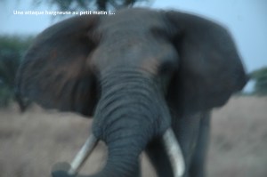Un matin, alors que la nuit se dissipait lentement, un vieil éléphant mâle hargneux nous chargea sans raison; mais James était sur ses gardes, et nous avons pu fuir avant qu’il ne nous atteigne. Même un Toyota Land Cruiser, pourtant assez imposant, ne semble pas être une réelle protection face à la charge d’un tel mastodonte.