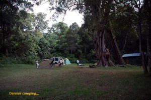 Arusha, dernière nuit de notre safari. Nous campons au pied du grand volcan sous des arbres gigantesques alimentés par les pluies beaucoup plus fréquentes près des montagnes élevées. Malheureusement, Marie souffre alors d’une turista en règle et notre séjour en est quelque peu affecté.