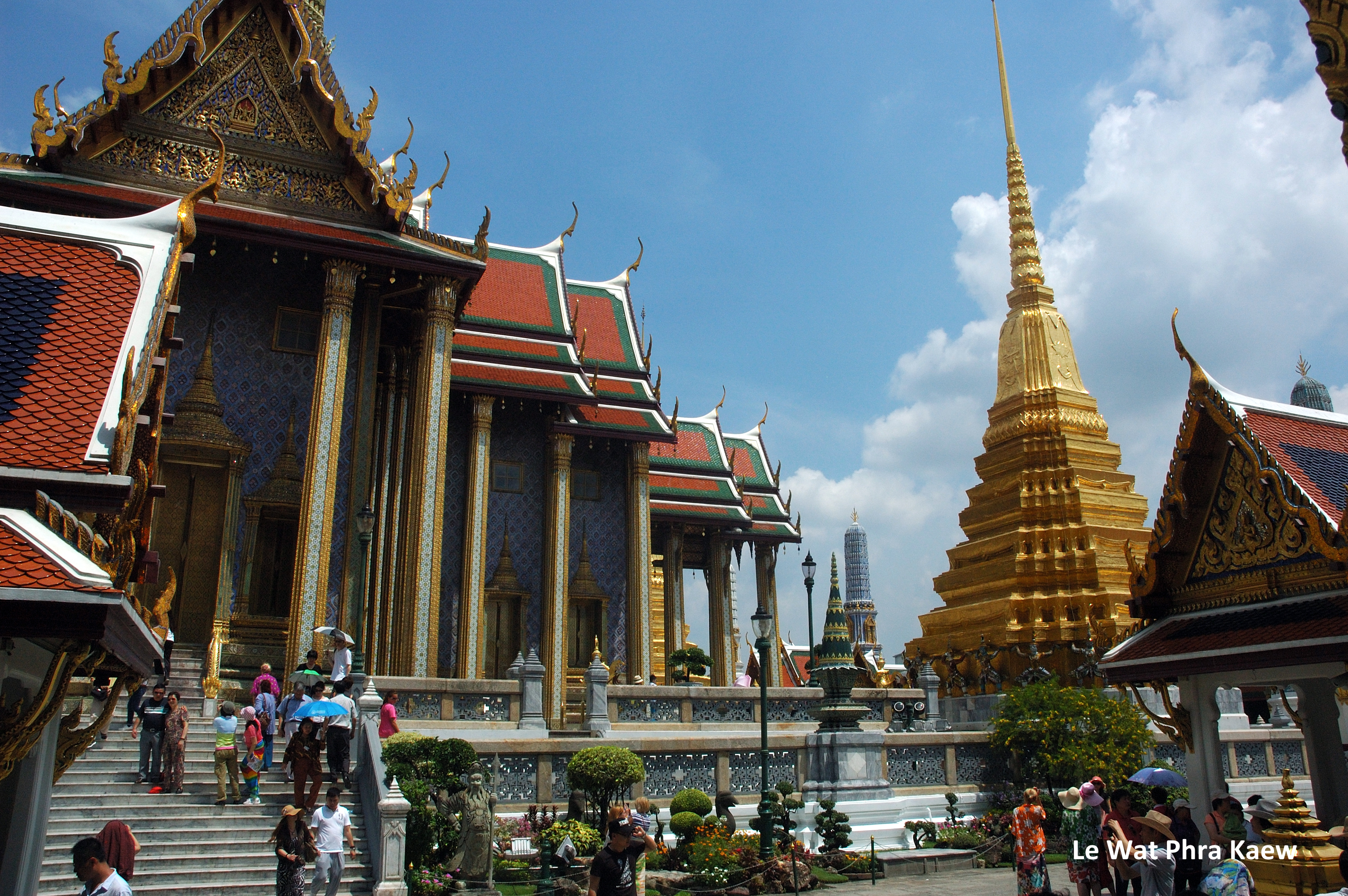 ce faire malgré quelques endroits plus « étranges ». C’est une ville moderne que nous avons finalement peu visitée par décision avant même d’y être, lors de la planification initiale de notre voyage; peu de gens consultés nous semblaient réellement emballés. Rien ne nous a fait changer d’avis lors de notre court séjour. Mais le fleuve Chao Phraya qui s’enroule en boucle autour de la ville demeure en endroit très vivant. A part une ballade pour visiter le palais national et le grand temple Wat Phra Kew, je dois avouer que nous nous y sommes peu promenés. Outre notre arrivée tardive après 36 heures sans dormir ou presque, nous avons dû consacrer notre premier avant-midi à aller nous procurer un visa à l’ambassade du Myanmar.