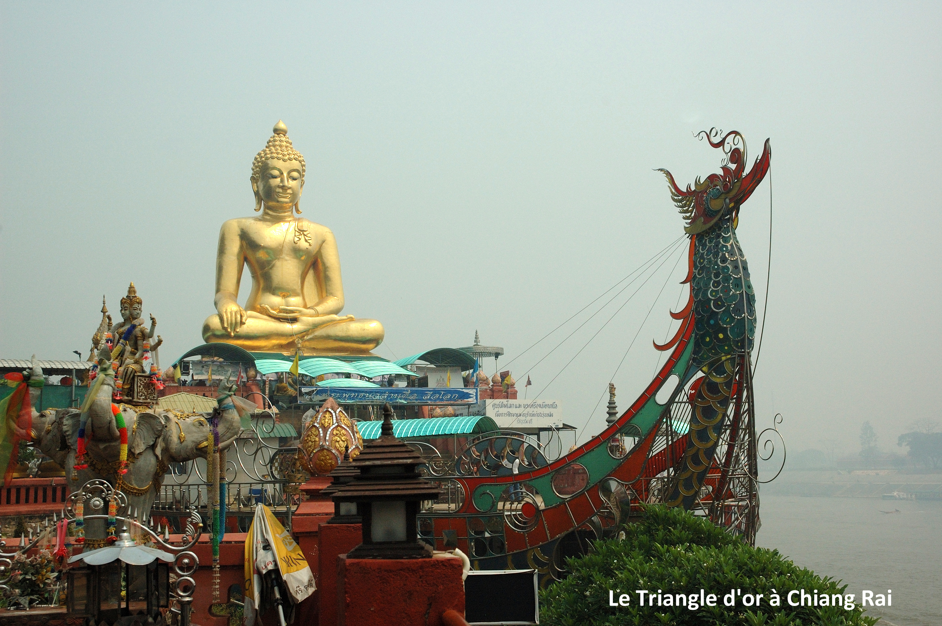 Notre excursion s’est poursuivie ensuite par la visite du centre géographique du Triangle d’or, au confluent de la Nam Kok et du Mékong, où se rejoignent la Birmanie, la Thaïlande et le Laos. En fait, pas grand-chose à voir sinon des monumentales horreurs touristiques dont pourtant la Thaïlande nous avait épargnés jusque là…