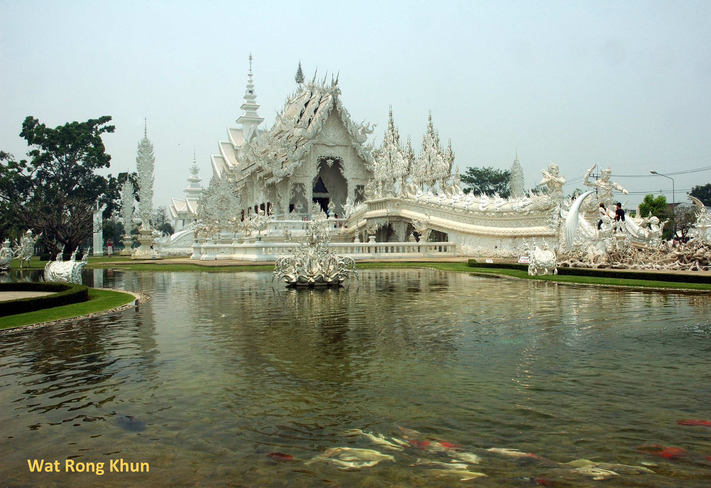 touristes), pagode moderne et bizarroïde au possible construite «par Chalermchai Kositpipat, un artiste thaï de renom qui a voulu créer un tribut durable à Rama IX, roi actuel de Thaïlande» (Wikipédia). En fait, cet édifice est fascinant par son côté architectural excessif d’une part (sculptures innombrables de monstres, de génies et de dieux, et un édifice doré pour les toilettes publiques –le contraire de ce qui se fait généralement), et par la simplicité de sa monochromie d’autre part.
