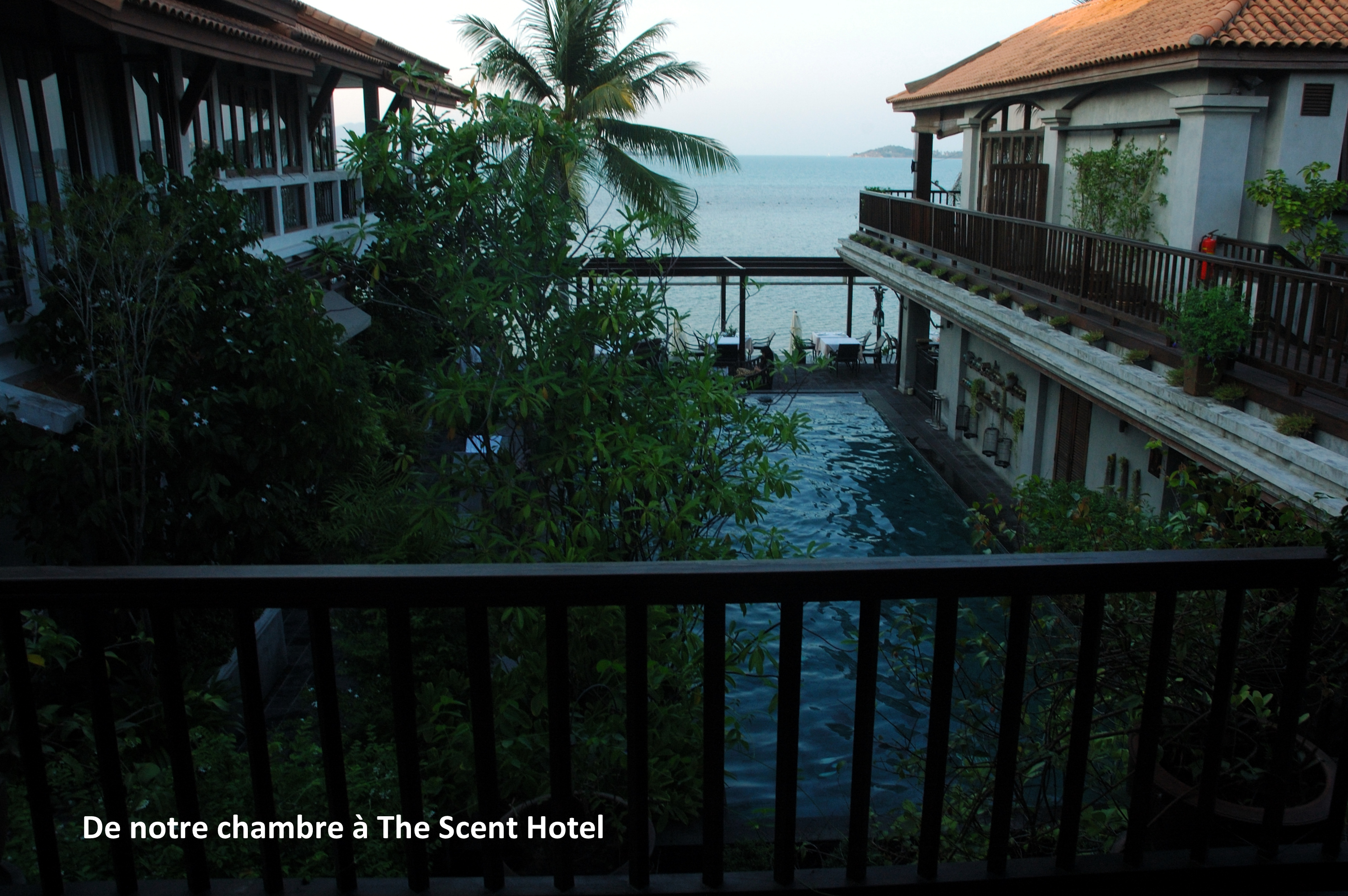 poursuivre vers le sud du Laos qui nous semblait quand même moins exceptionnel que ce que nous y avions déjà vu. Cependant, nous ne voulions ni résider dans un endroit très achalandé comme Phuket, ni perdre trois jours sur cinq à voyager vers une destination insulaire perdue aux confins de la Thaïlande; nous avons donc opté pour Ko (île) Samui, accessible en une journée d’avion de Vientiane et à une heure de vol de l’aéroport international de Bangkok d’où nous devions prendre notre vol de retour. Mais à Samui, nous avons choisi un hôtel Relais et Châteaux sur une partie de l’île plus familiale, plus paisible, Ban Mae Nam sur la rive nord. Notre hôtel, «The Scent», était magnifique et à prix réduit à cause de la saison; les repas y étaient aussi somptueux, mais très coûteux, et la plage très jolie, mais non baignable (un fond de vase et de rochers).