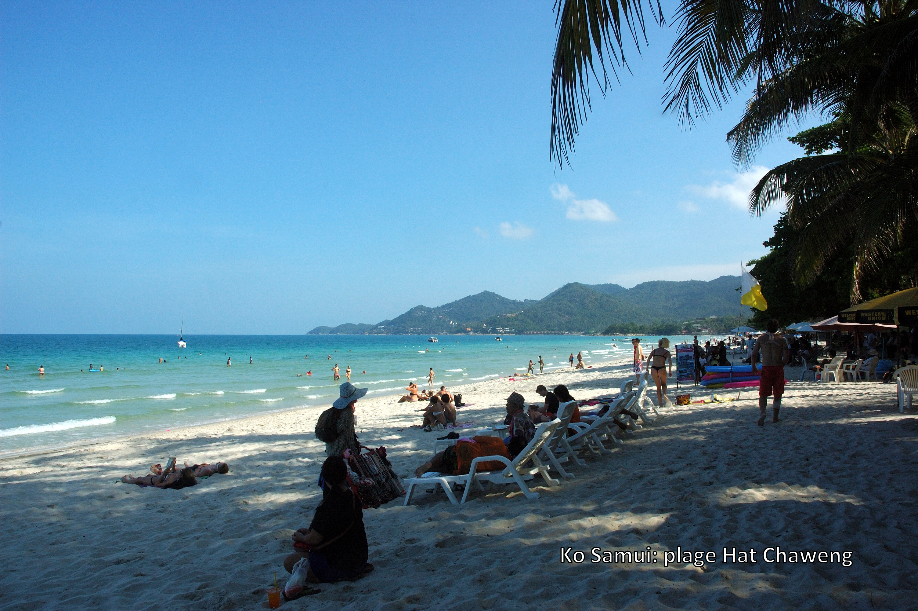 de pêcheur ne se pointe. Les soupers sur la plage, dans la douceur du crépuscule, y étaient magnifiques. Et nous avons aussi passé un après-midi sur la grande et splendide plage de Hat Chaweng du côté est de l’île. Il faut croire que les journées y commencent tard et que probablement les nuits y finissent au petit matin, car la plage ne se remplit que vers la fin de l’après-midi. Pour ce faire, il faut vivre selon un autre rythme que celui qui est le nôtre; notre vie errante est d’abord orientée vers les visites plutôt que vers le farniente et la fiesta.