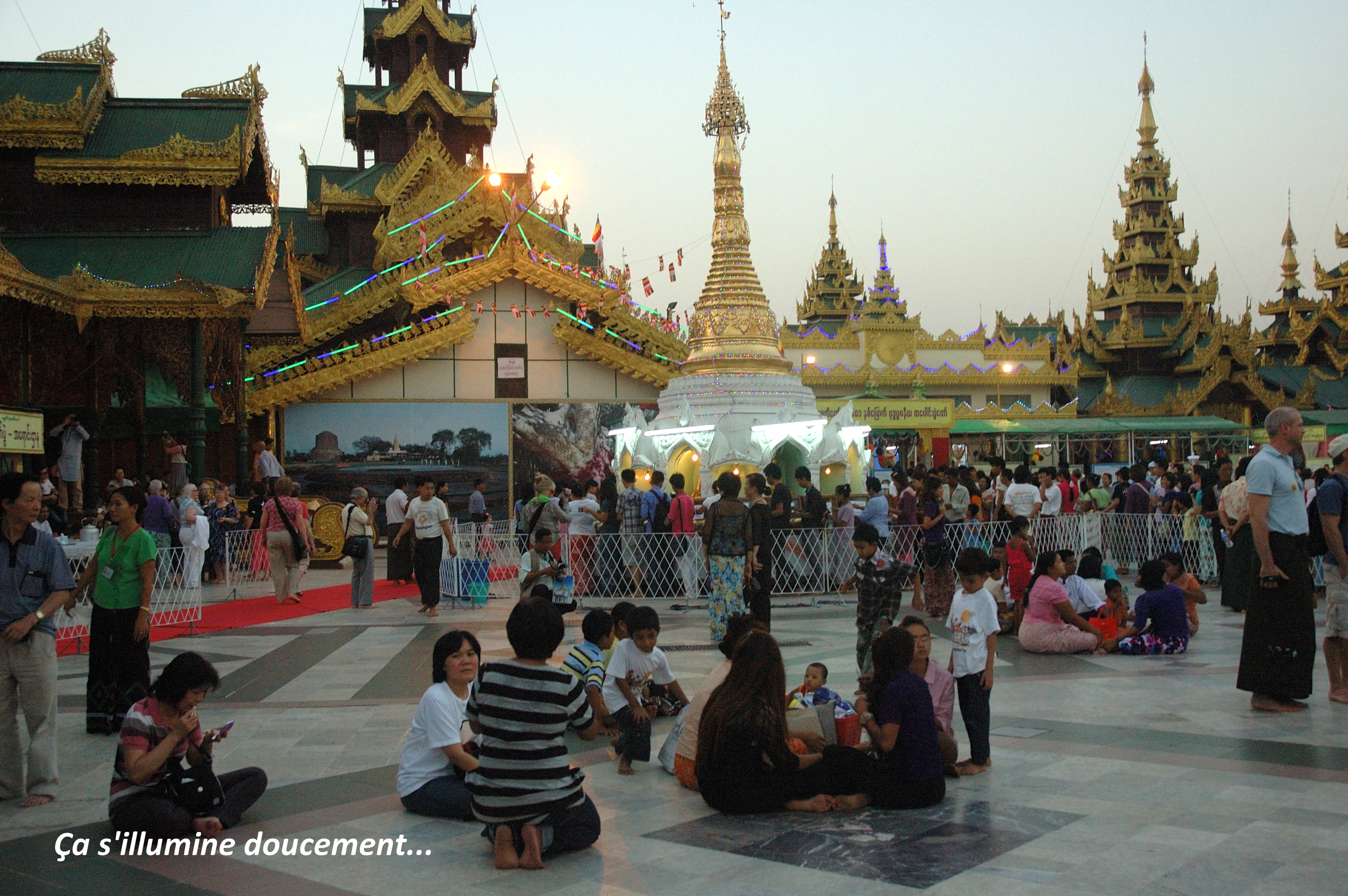 Pour en revenir à la Shwedagon, nous avons tellement aimé l’atmosphère qui imprègne le lieu que nous y sommes retournés le deuxième et dernier soir de notre séjour à Yangon. C’est absolument magnifique de voir le crépuscule descendre lentement sur le site qui s’illumine en même temps; malgré la foule, tout y semble si paisible… Il s’en dégage une spiritualité qui nous atteint profondément, tout agnostiques que nous soyons.