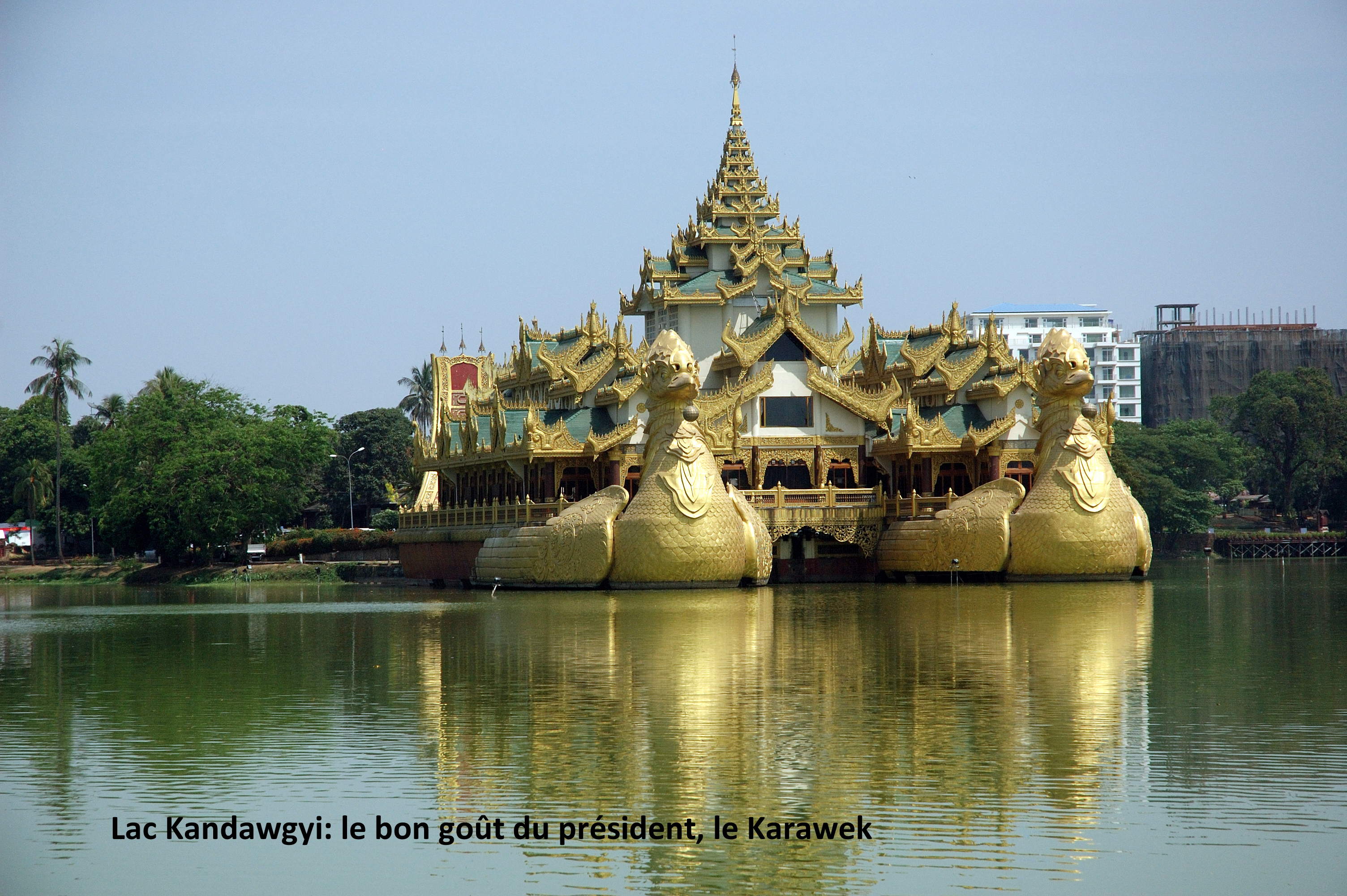 me ce lieu magnifique, le chef d’alors de la junte, le général Than Shwe, a réussi à le dénaturer avec un affreux restaurant, monument national et emblème du «Myanmar», l’horrible Karaweik; évidemment, nous n’y sommes pas allés nous restaurer.