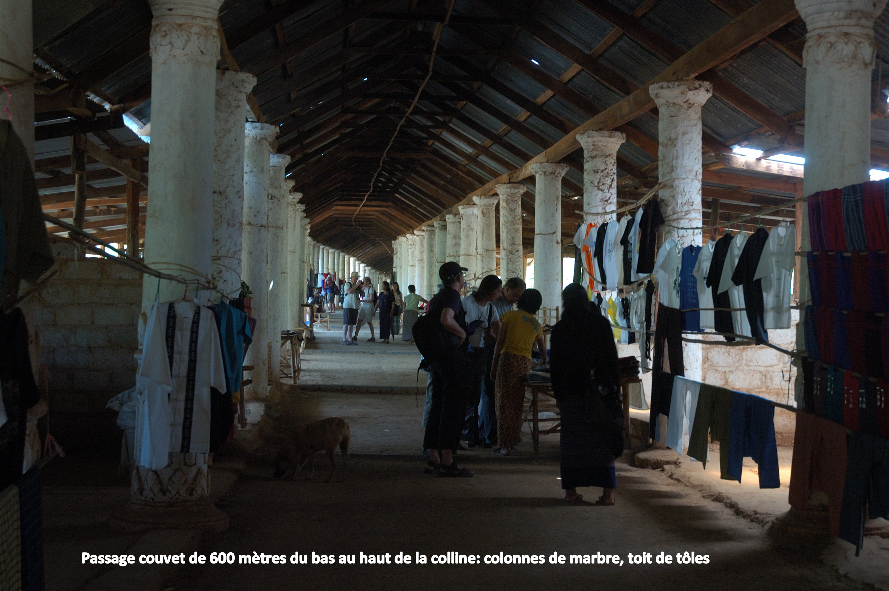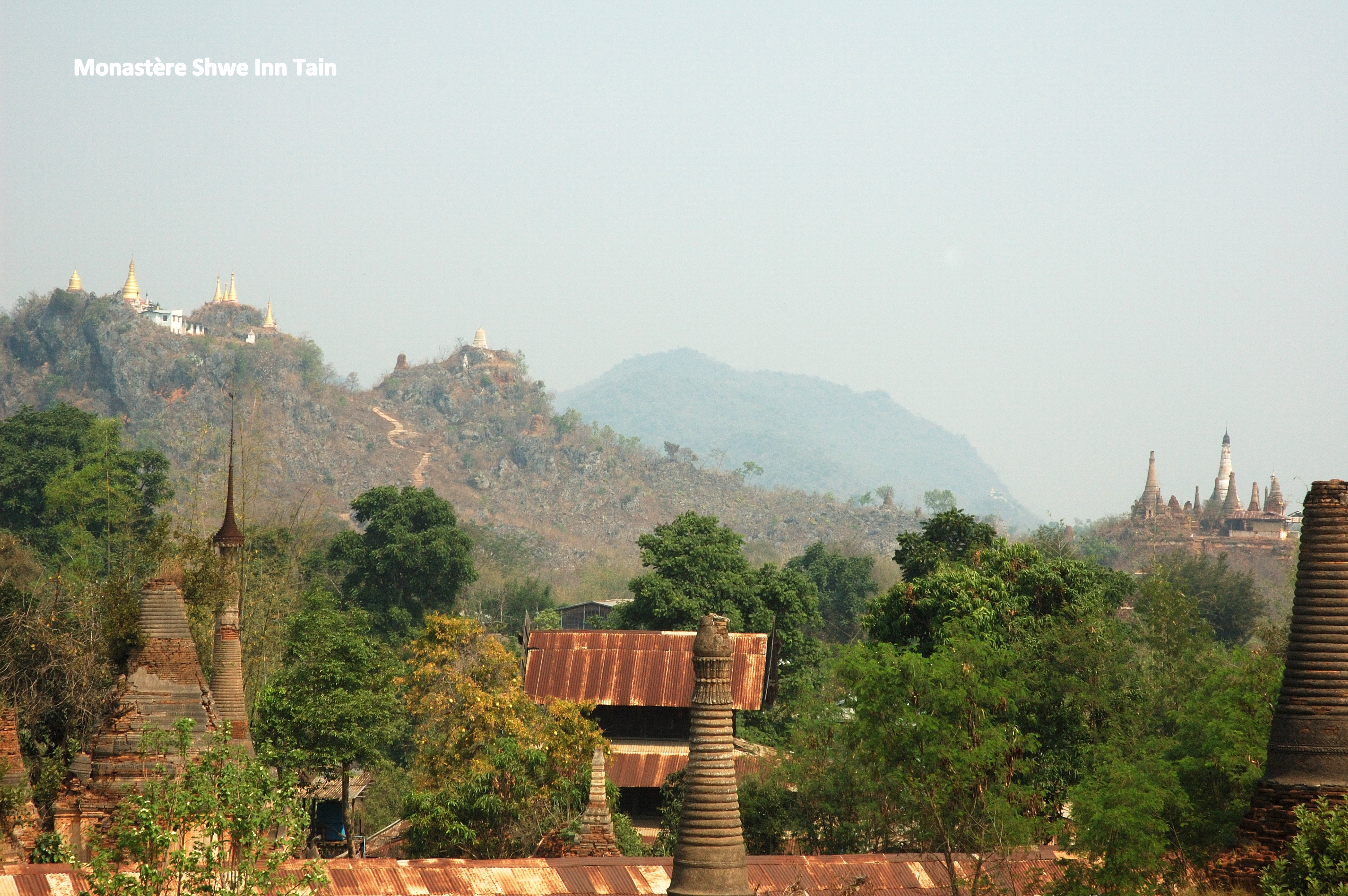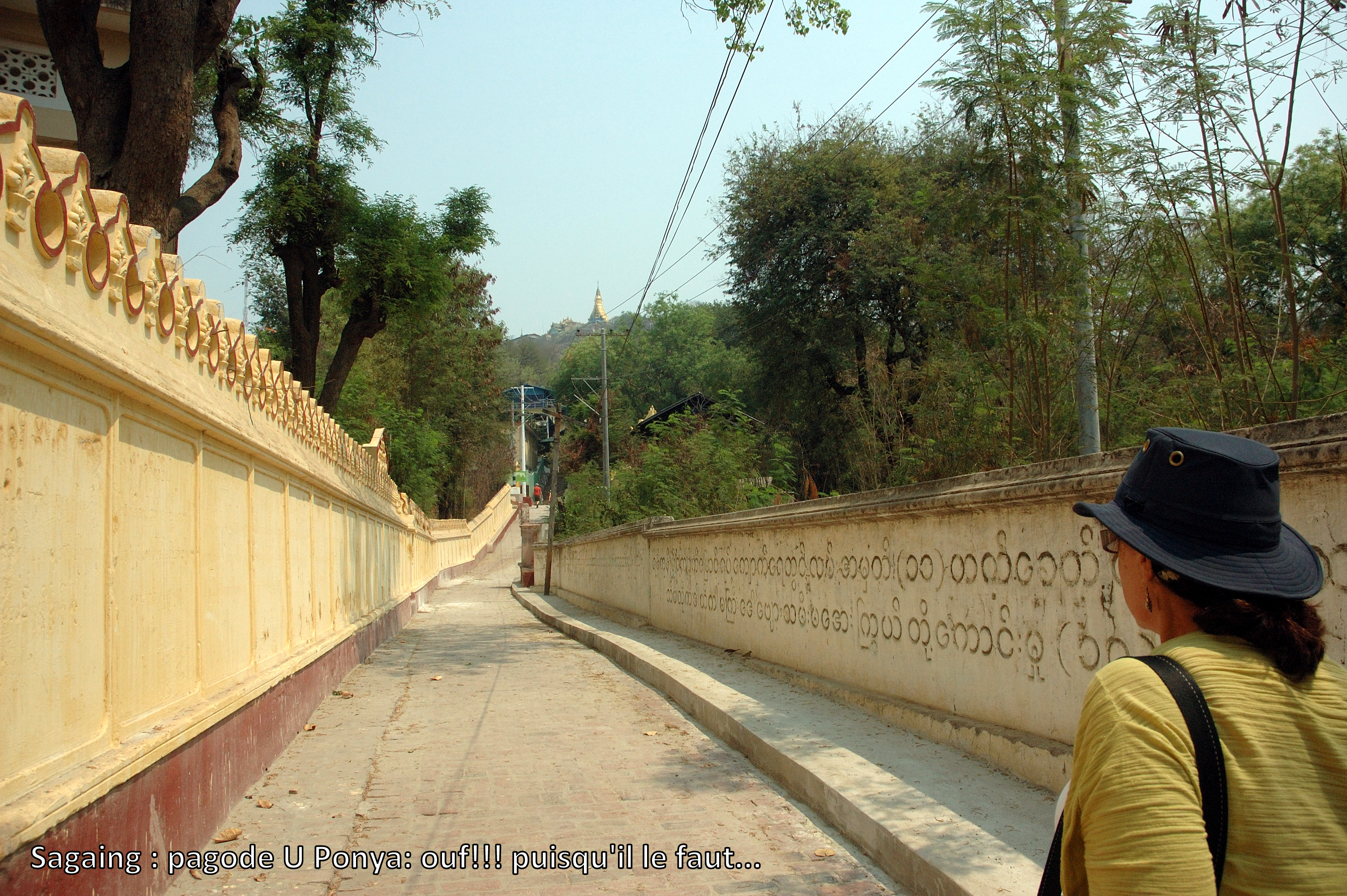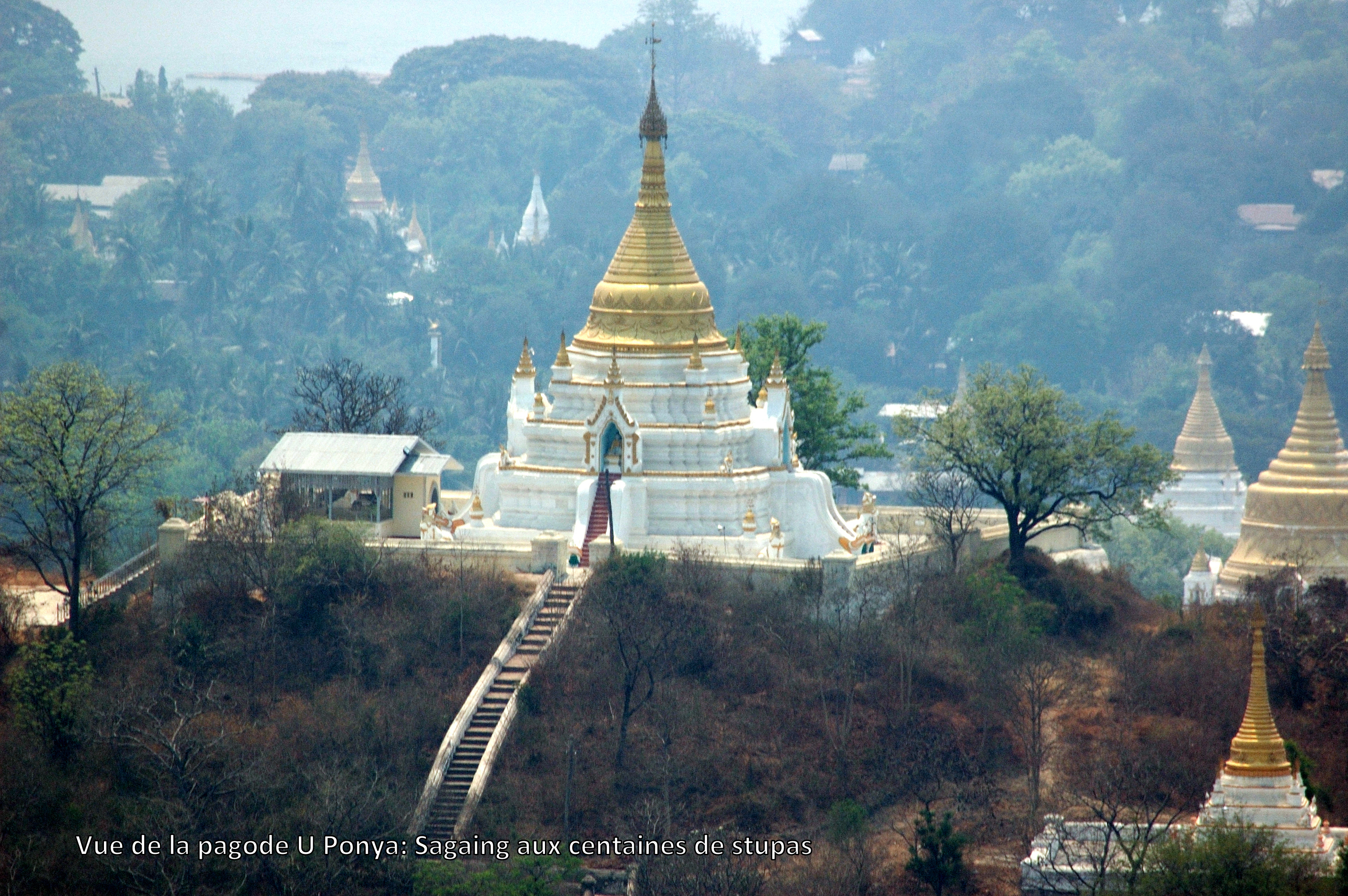 éparpillés sur ses multiples collines. Tout d’abord, une longue montée nous attend vers la Pagode U Ponya qui domine tous les environs. Comme d’habitude, il s’agit d’un très long escalier couvert pour nous protéger du soleil ou de la pluie selon la saison. Là aussi, plus que la pagode elle-même, c’est le panorama qui justifie nos efforts.