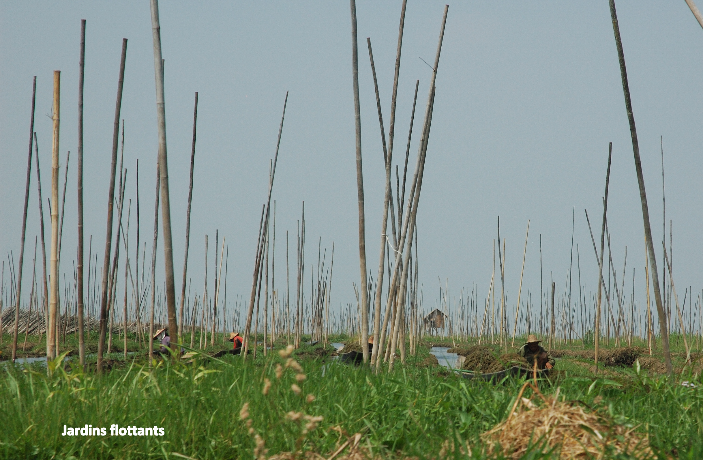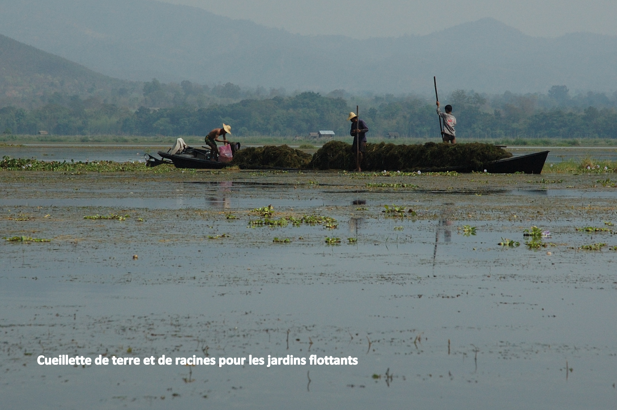 constitués de d’immenses tapis de jacinthes d’eau (pour le demeurant elle reste une plante particulièrement envahissante et nuisible), ancrés sur place par des poteaux de bambou, et sur lesquels on dépose du limon provenant du fond du lac et qu’on fertilise avec des algues.
