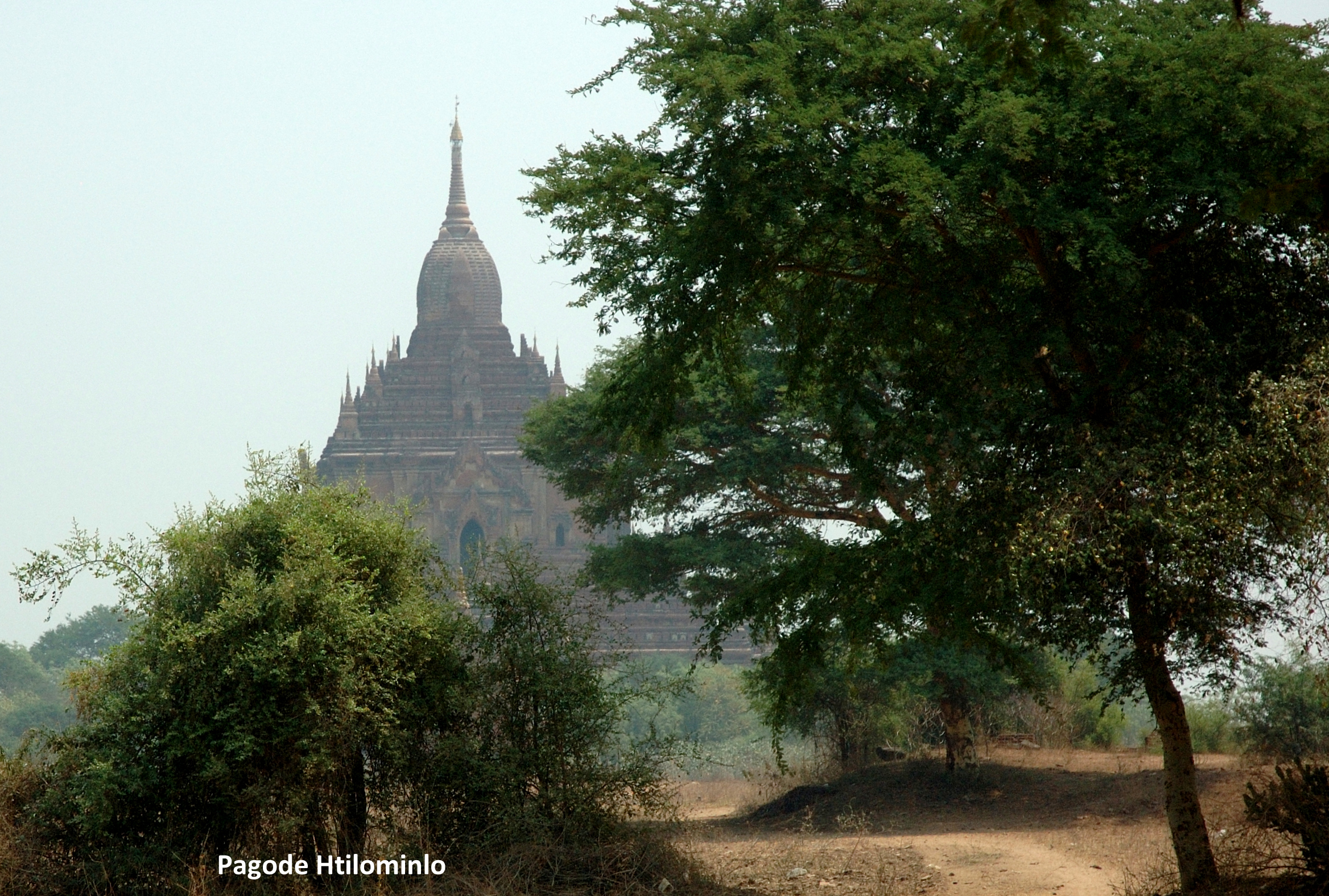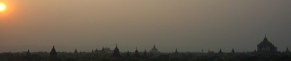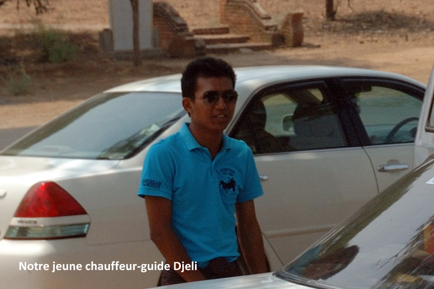 Nous avons passé deux jours, soit quatre demi-journées à visiter cet immense site, n’en voyant cependant qu’une faible partie. Je dois avouer qu’à la fin nous étions un peu las de tant de temples et monastères anciens. Mais à chaque soir, au crépuscule, tous les touristes (probablement deux ou trois cents au total ) se retrouvaient à une ou l’autre des quatre grandes pagodes dont l’ascension est permise pour contempler le coucher du soleil sur cette terre aux centaines de stupas, dômes et autres structures dépassant le faîte des acacias. Nous nous y sommes toujours présentés, malgré la fatigue de la journée et des couchers de soleil souvent bien faméliques en cette saison sèche et enfumée. Et il y avait toujours, grâce à Djeli, un petit fait qui justifiait notre présence.