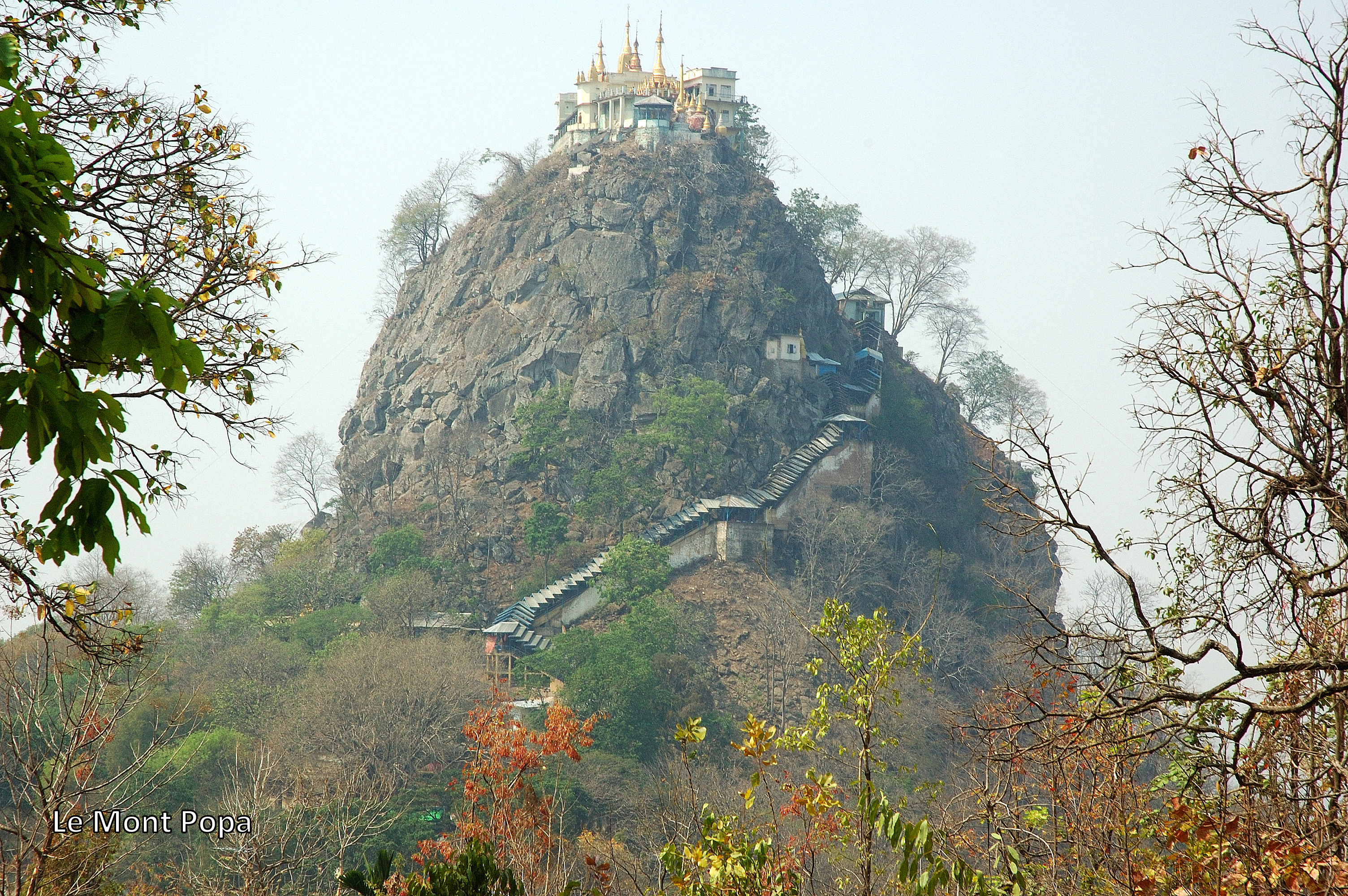 Enfin, nous en avons aussi profité pour effectuer une ballade dans les environs jusqu’au temple du mont Popa. Ce dernier est situé sur le sommet d’un pic rocheux et peut faire penser aux monastères des Météores en Grèce. La vue que nous en avons en