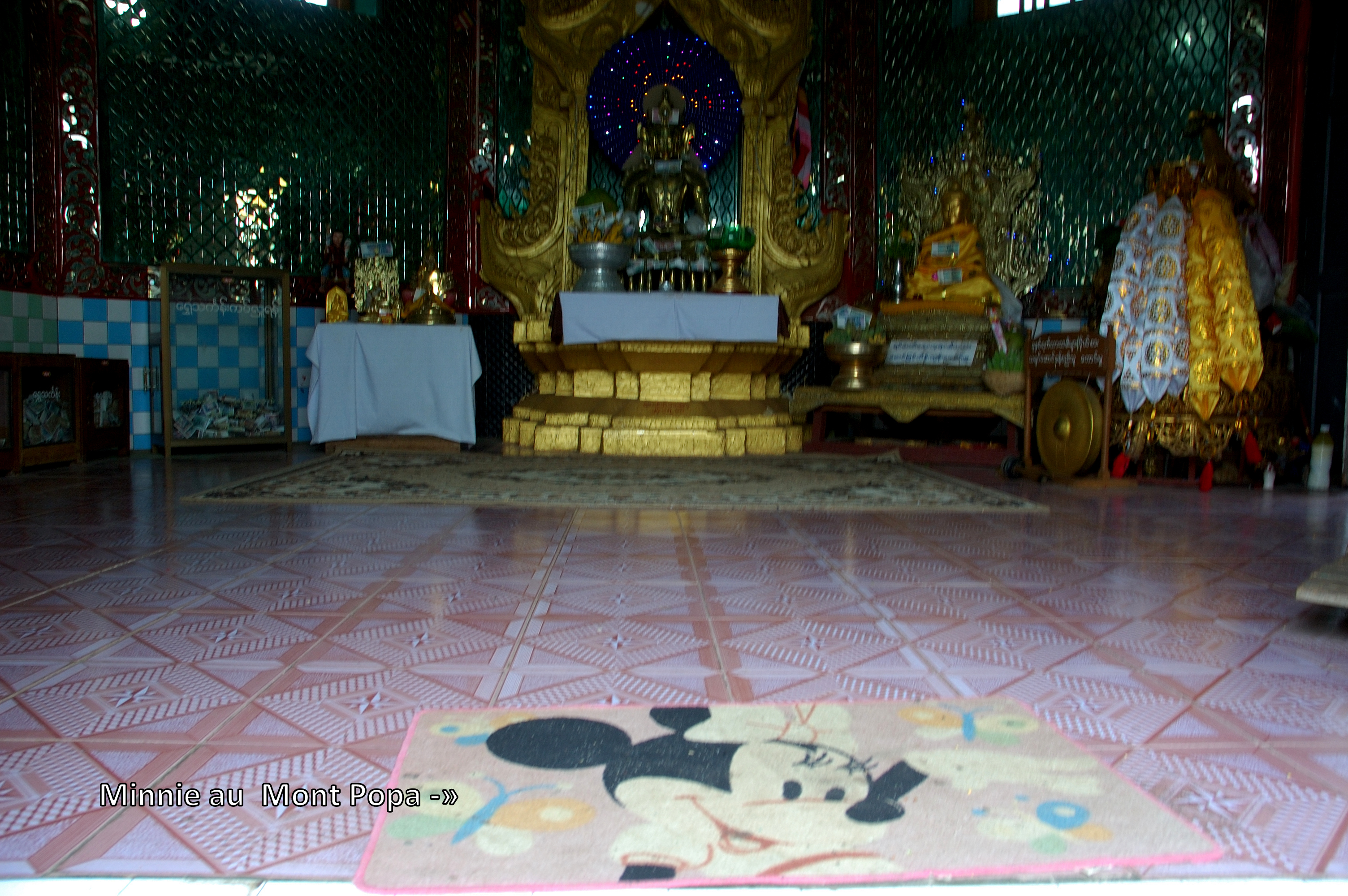 approchant du village qui l’abrite relève de l’imagerie fantastique. Le temple lui-même est un peu quelconque, mais la longue montée des 700 marches (parfois en escalier, parfois une quasi-échelle) constitue en quelque sorte un petit pèlerinage épuisant qui valorise l’arrivée en ce lieu saint. Et si ce temple n’a pas encore été récupéré par Disney, il a introduit l’imagerie populaire de ce dernier en son sein comme en fait foi la photo ci-contre ! Kitsch, naïf ou « quétaine » ?
