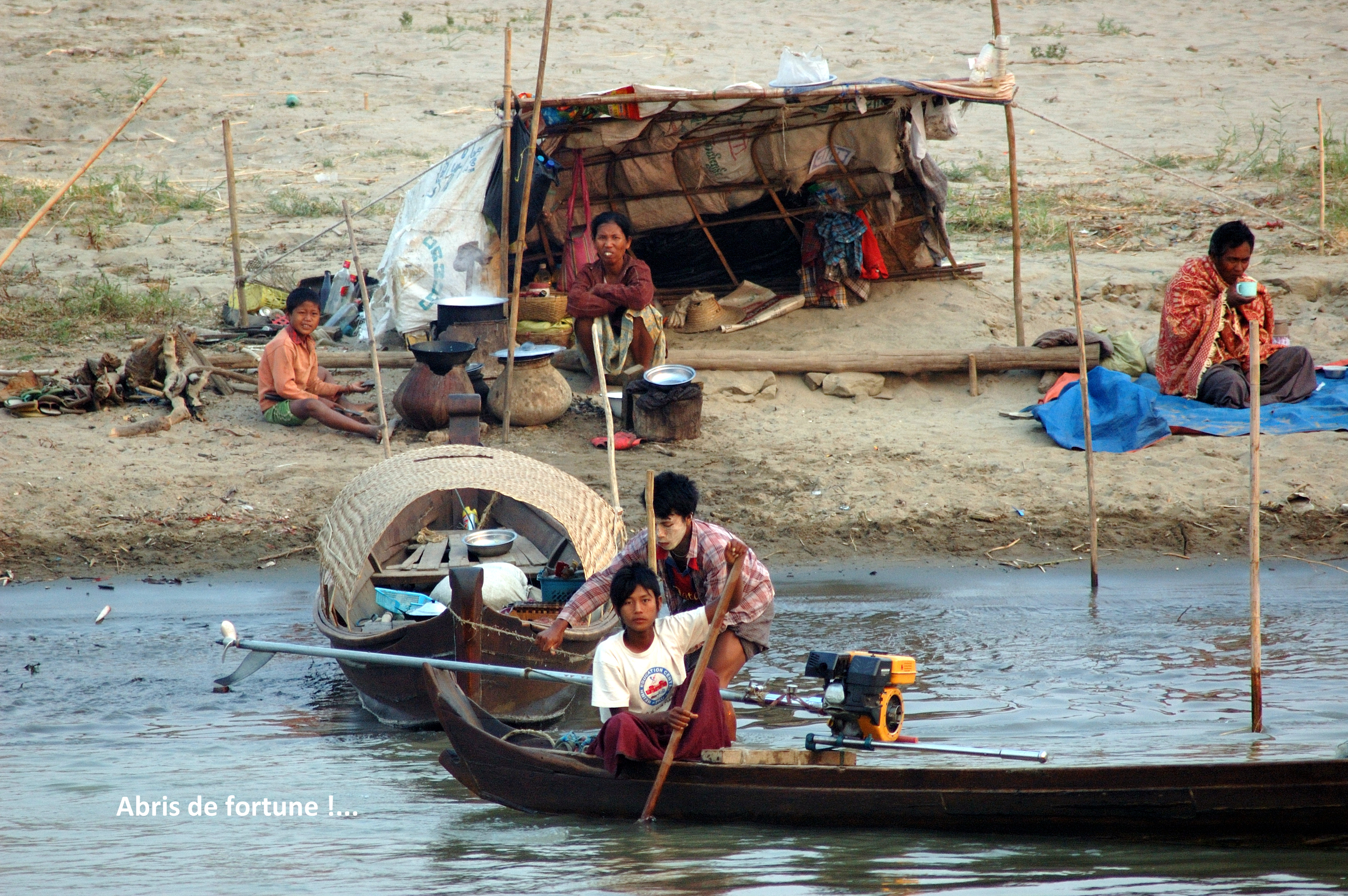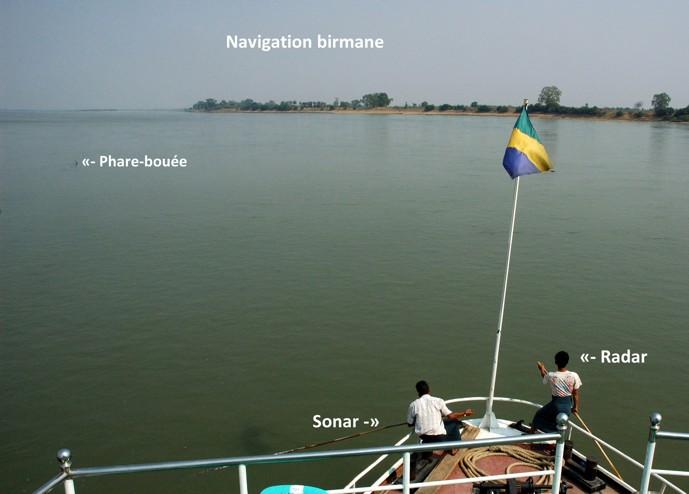 en cette fin de saison sèche et le risque de s’échouer sur des bancs de sable, sans cesse en déplacement, est très grand. Les bouées sont constituées de perches de bambou plantées dans le lit du fleuve ici et là, et le sonar est constitué de deux membres d’équipage qui mesurent la profondeur de l’eau à l’avant de la proue et annoncent en criant de façon continue, dans les zones critiques, la profondeur mesurée à l’aide d’une perche graduée. On n’arrête pas le progrès !…