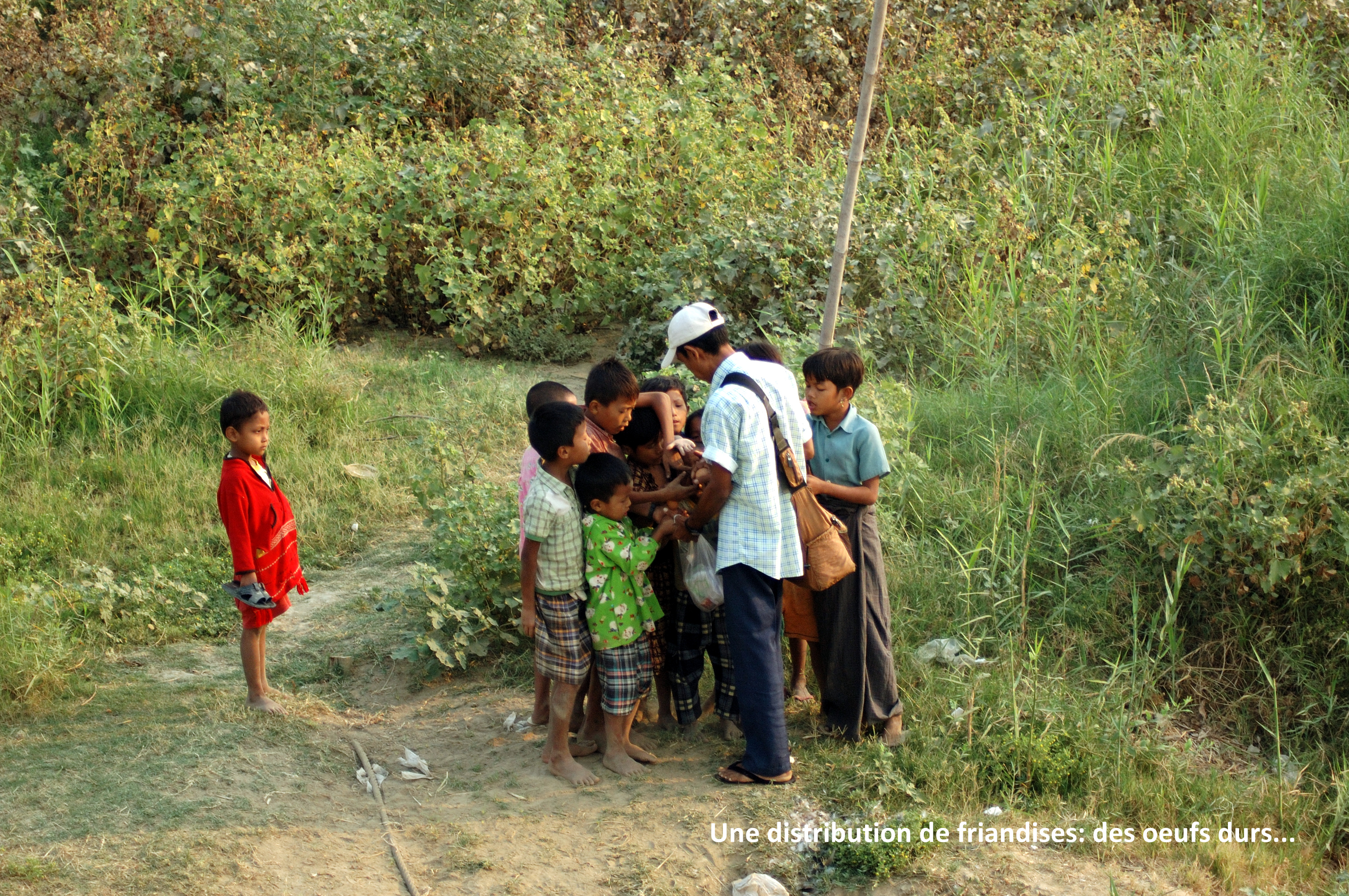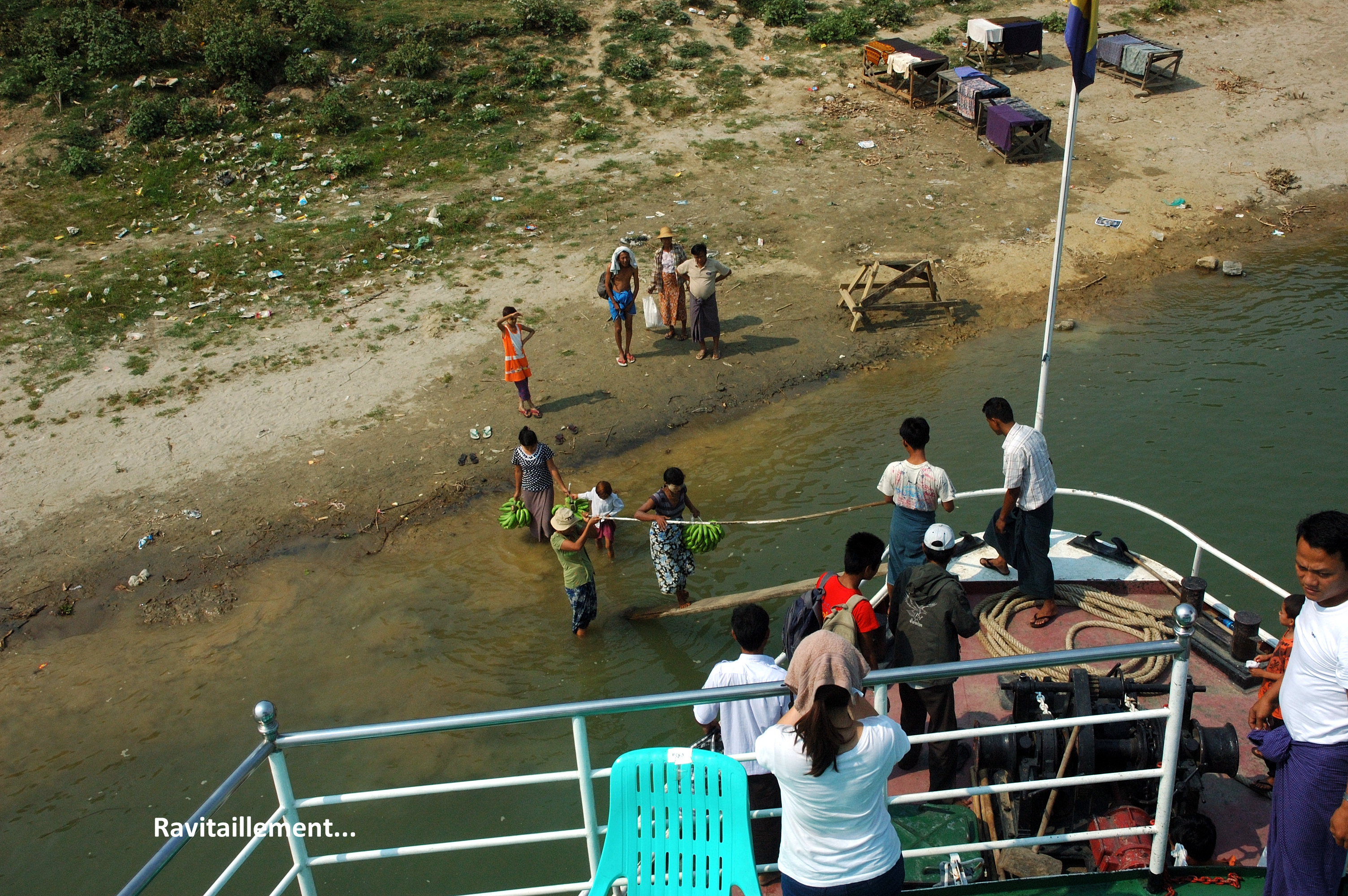 fleuve où un enfant se précipite pour le cueillir, risquant d’être écrasé entre la rive et le navire. Je n’ai pas de photographie de ce dernier point, car comme tous les spectateurs j’ai hurlé de peur pour l’enfant. Un œuf dur est une friandise incroyable en Birmanie où le menu quotidien est généralement composé de riz et de quelques légumes. Un peu plus tard nous accostons encore brièvement de la même manière pour ramener un jeune homme malade chez lui : le passage est payé en régimes de bananes.