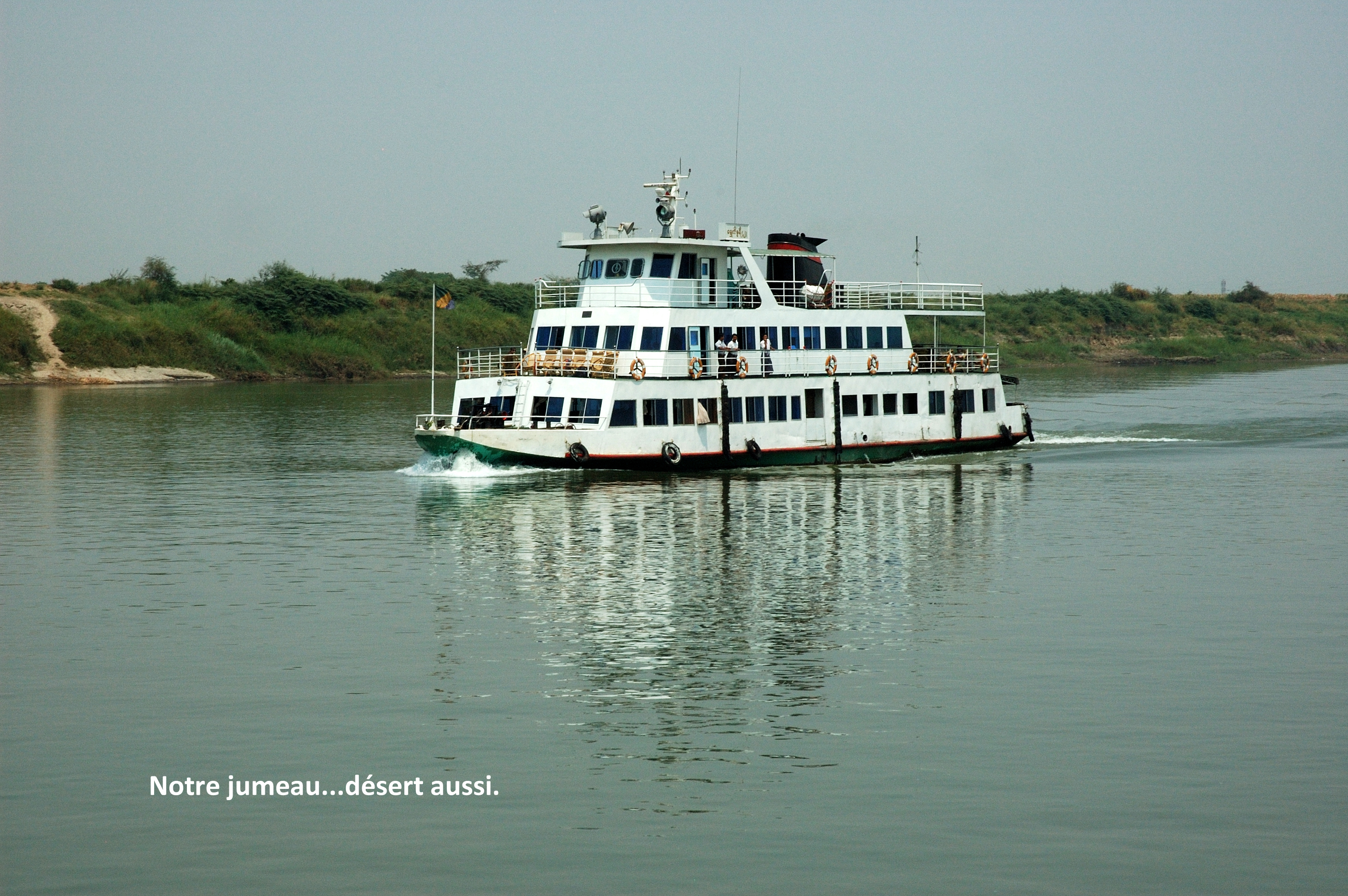 Nous sommes partis de Bagan avant même l’aurore dans un navire ressemblant à un vieux traversier pour une croisière de 14 heures. Nous avons remonté le fleuve, au lieu de le descendre comme la majorité des touristes, jusqu’à Mandalay (34$US par personne, repas modestes inclus). Nous n’étions que huit touristes sur ce bateau qui peut en contenir près de deux cents en haute saison et pendant le périple de descente vers Bagan.