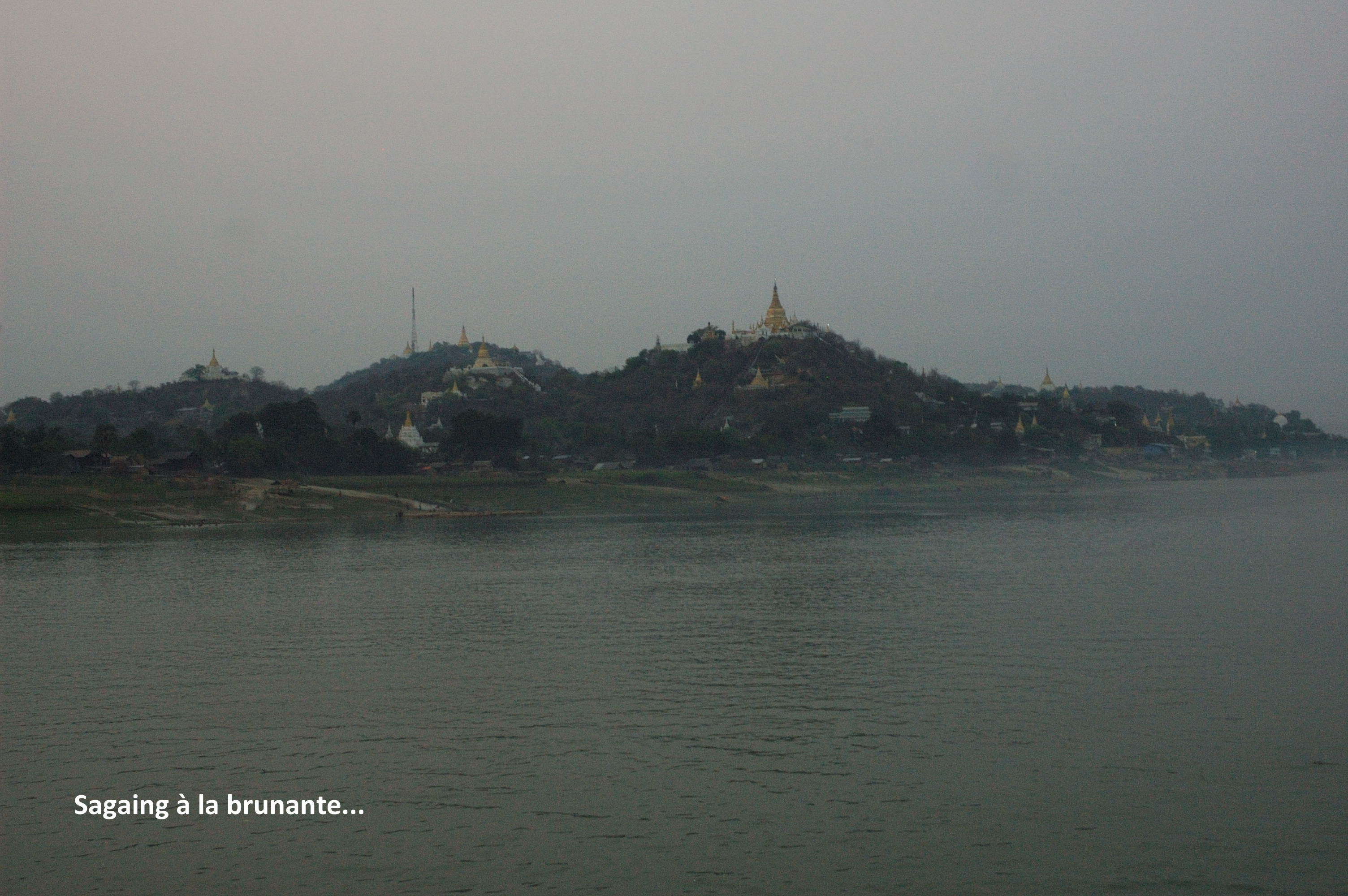 Nous passerons à la brunante devant Sagaing la splendide et ses nombreux stupas élevés sur les collines qui l’entourent. Un paysage irréel… Et finalement, nous accosterons à Mandalay à la nuit tombée dans un navire qui n’a pas de phares pour la route et qui navigue sur un fleuve obscur, sans bouées ou autres repères. L’aventure pour nous, le quotidien pour eux…