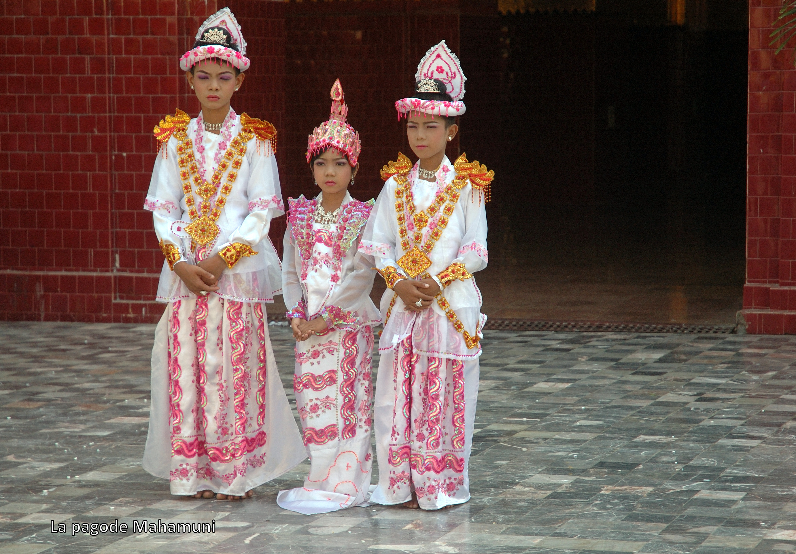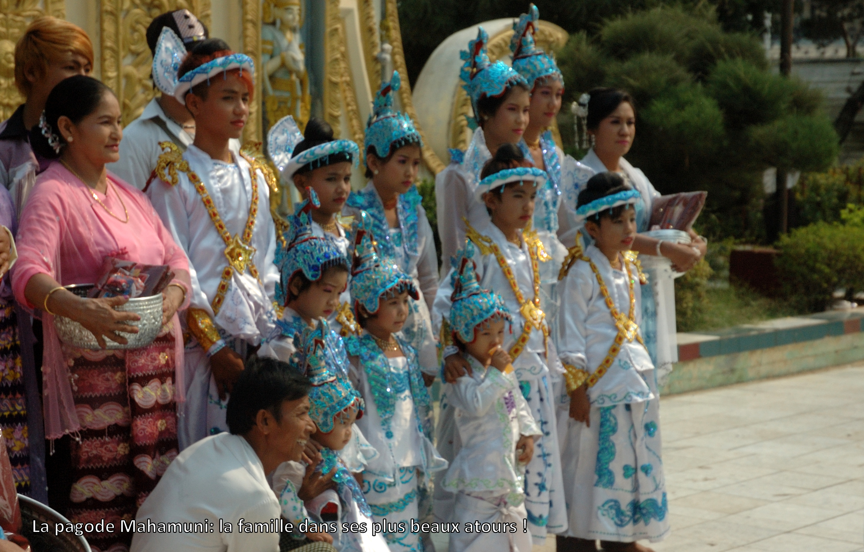 d’abord, la grande pagode Mahamuni: moins imposante que la Shwedagon de Yangon, elle s’est avérée encore beaucoup plus intéressante pour nous. Pendant toute notre visite, des familles habillées de beaux atours traditionnels venaient fêter le début du stage monial des petits garçons ou filles. Toute la famille y participe, même si seules les femmes