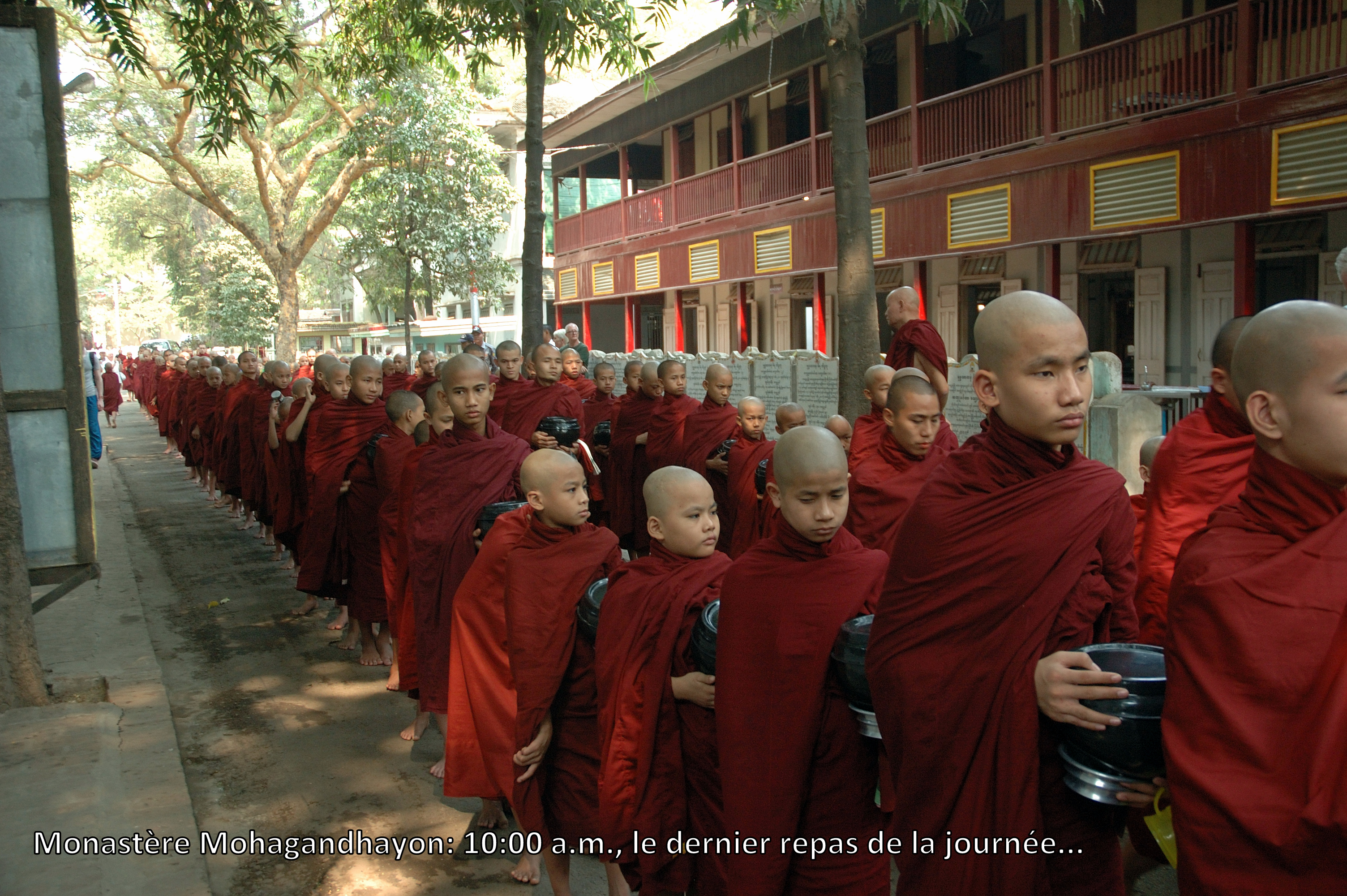 Et après ces cérémonies d’intronisation, nous sommes allés dans un monastère où les jeunes garçons vont faire leur stage de moines. Ils s’alignent en longues colonnes pour recevoir leur dernier repas de la journée vers 11 :00 am. Mais il y a là des cars de touristes venus comme nous voir et photographier l’évènement; cela ne semble pas troubler outre mesure les moinillons , contrairement à moi qui me sentait un peu voyeur.. J’avais toujours cru que ces moines étaient des orphelins ou des jeunes que les familles très pauvres confiaient aux monastères (en fait, ils ne sont que 10% des novices); je viens de découvrir que, du moins en Birmanie et au Laos, il s’agit en fait d’un rite d’initiation social et religieux auquel même les filles sont soumises (mais de façon moins systématique).