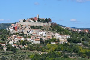 de la péninsule istrienne pour un périple des villages perchés de la région. Il s’agit donc d’un petit circuit champêtre que nous nous parcourons lentement au gré des collines et des vallées où se succèdent ces petits villages perchés ; et apparait soudain au loin celui qui est probablement le plus beau de cette région vinicole, Motovun, haut lieu de la cueillette de la truffe et aussi d’oliveraies. Le village lui-même est petit, mais il y a quelques cafés et on peuty loger (ce que nous n’avons pas fait, contrairement à nos amis Suzanne et Jean-Claude qui s’y sont aussi fait éveiller par les aboiements des chiens renifleurs de truffes).