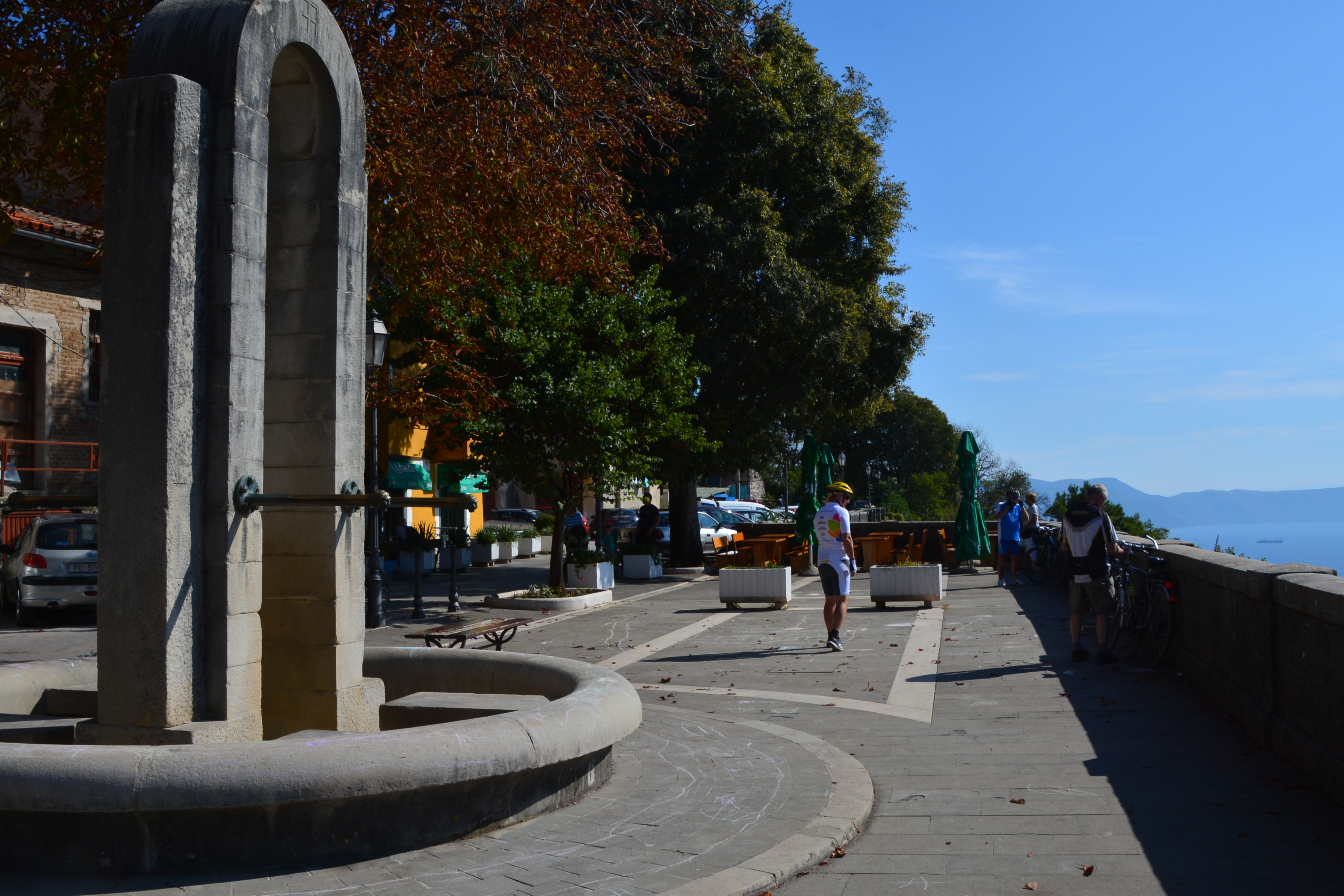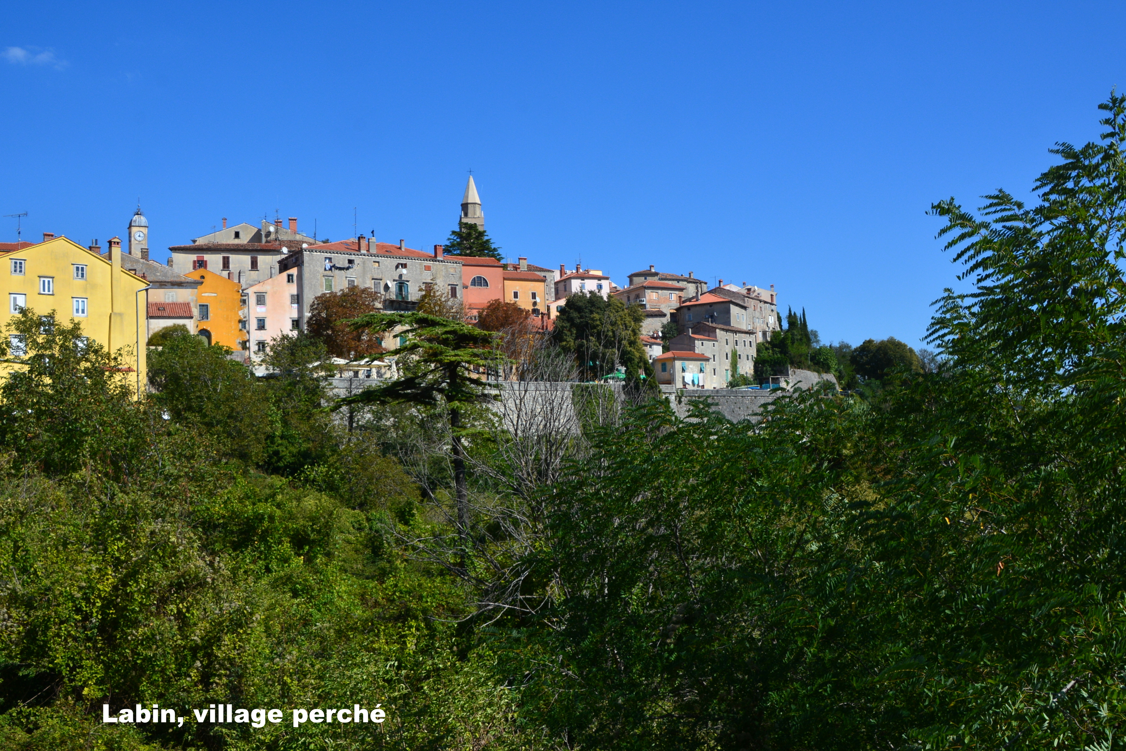 devons côtoyer Labin, un ancien gros bourg perché sur une montagne dominant la côte, nous nous arrêtons pour le visiter. Une fois stationné sur la place centrale à l’extérieur des murs, nous parcourons tout d’abord une magnifique ter-rasse dominant la mer au loin.