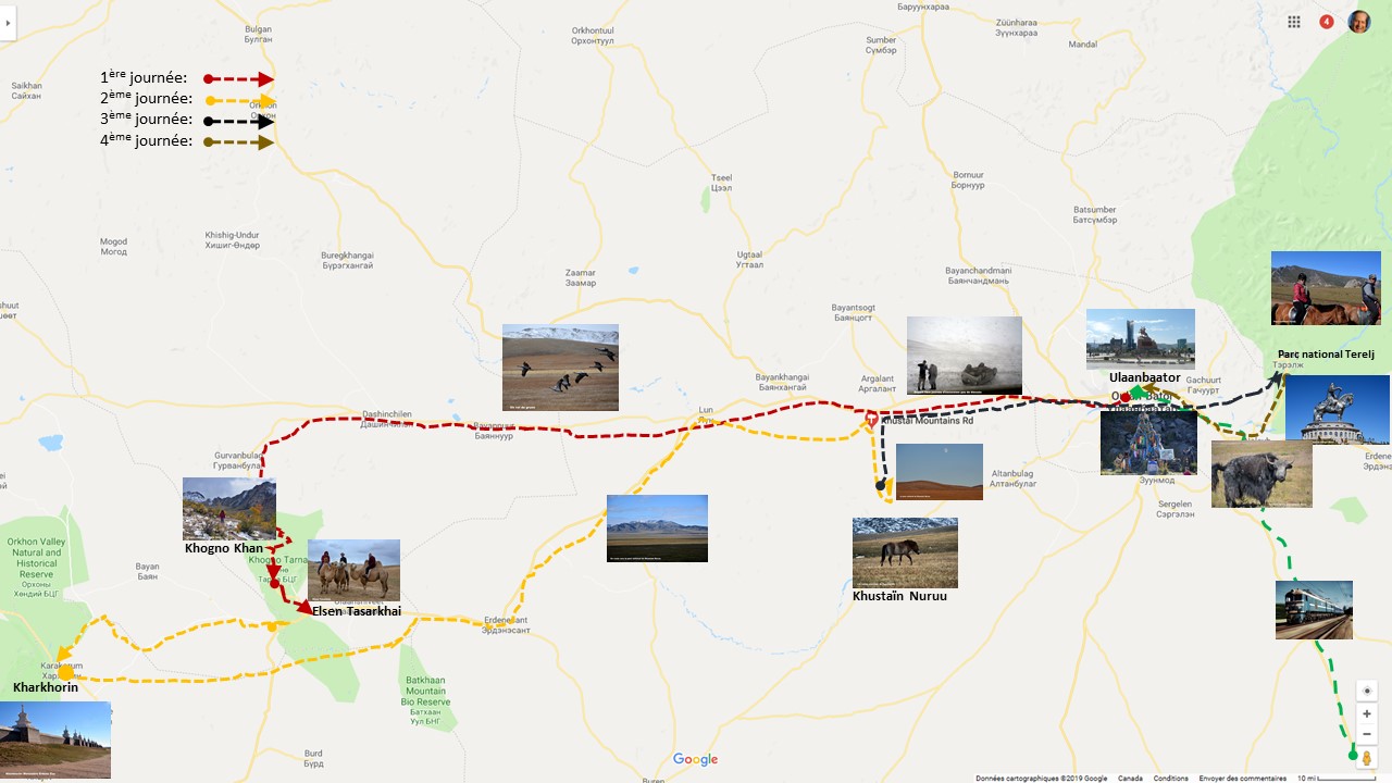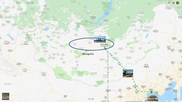 mes billets de train réservés et mes dates de voyage fixées, j’avais réservé une excursion de quatre jours (3 nuits) pour visiter la « vraie » Mongolie, puisqu’il n’y a aucune ville d’importance à part Ulaanbaator (1 million des 3 millions d’habitants vivent dans cette ville assezl aide). Notre périple ne se déroulerait que dans le centre du pays, 450 kilomètres séparant ses deux extrémités: l’ancienne capitale Kharkorin et le parc national Terelj (ovale dans la carte ci-jointe). Nous laissions donc tomber le désert de Gobi et les montagnes du sud-ouest et la chasse au faucon; le pays est bien trop vaste pour tout voir en quelques jours.