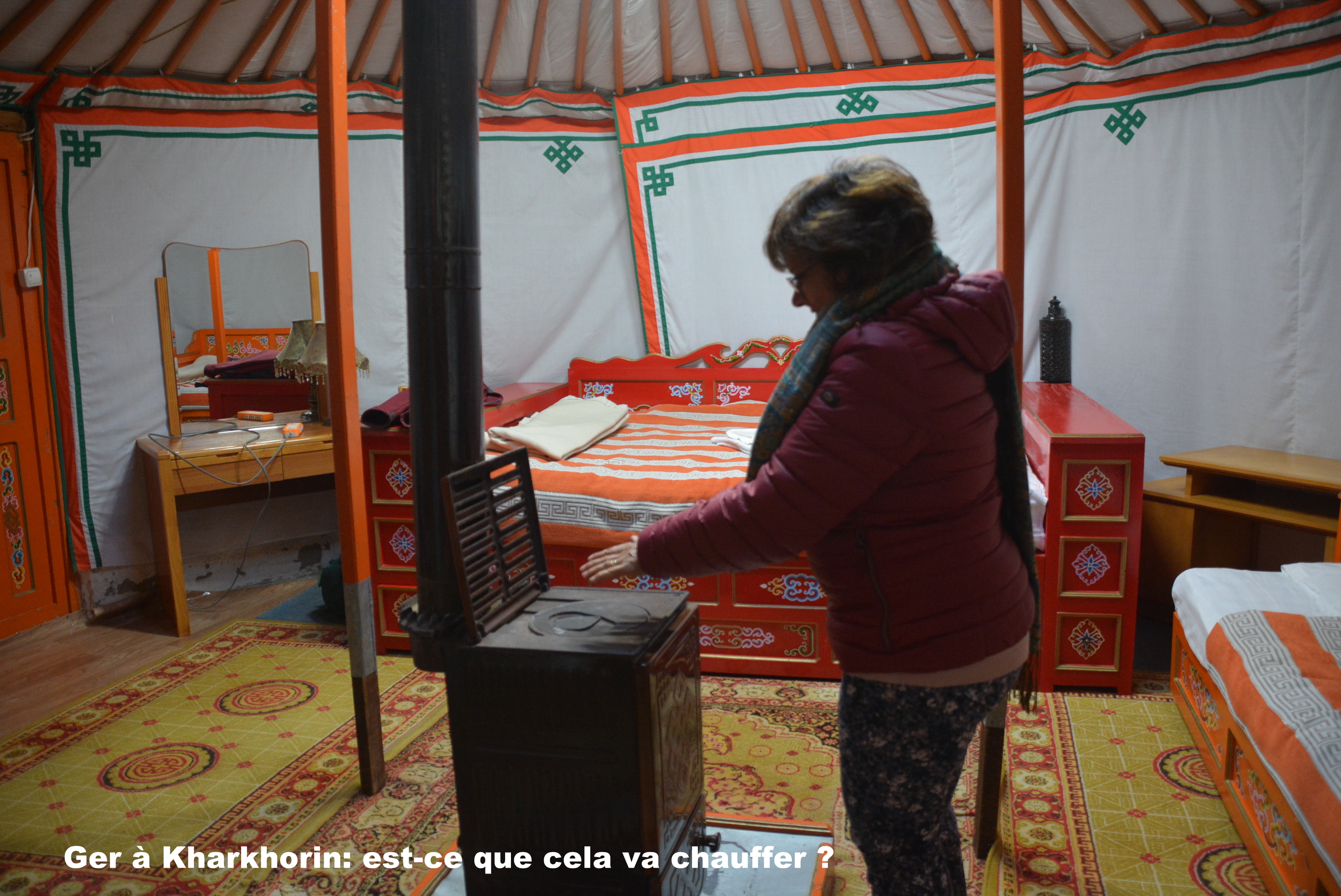 capitale de la Mongolie aux temps de sa grandeur et de Gengis Khan (XIIème siècle). On nous a attribué un ger confortable qu’il a fallu tout d’abord qu’ils réchauffent en allumant difficilement une fournaise au charbon.