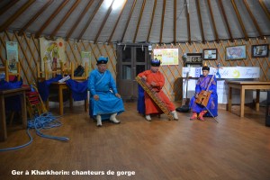 avons vécu le froid dès que nous mettions un orteil hors de notre lit. Une expérience agréable quand même, d’autant plus qu’après un souper très acceptable, nous avions assisté à une soirée présentée par des musiciens et chanteurs de gorge traditionnels : ce chant est beaucoup plus diversifié que ce qu’on peut entendre chez les Inuits, le même chanteur à gauche pouvant produire des sons très aigus ou très graves (vous pouvez avoir une petit aperçu en cliquant sur le lien suivant: Chants traditionnels mongols).