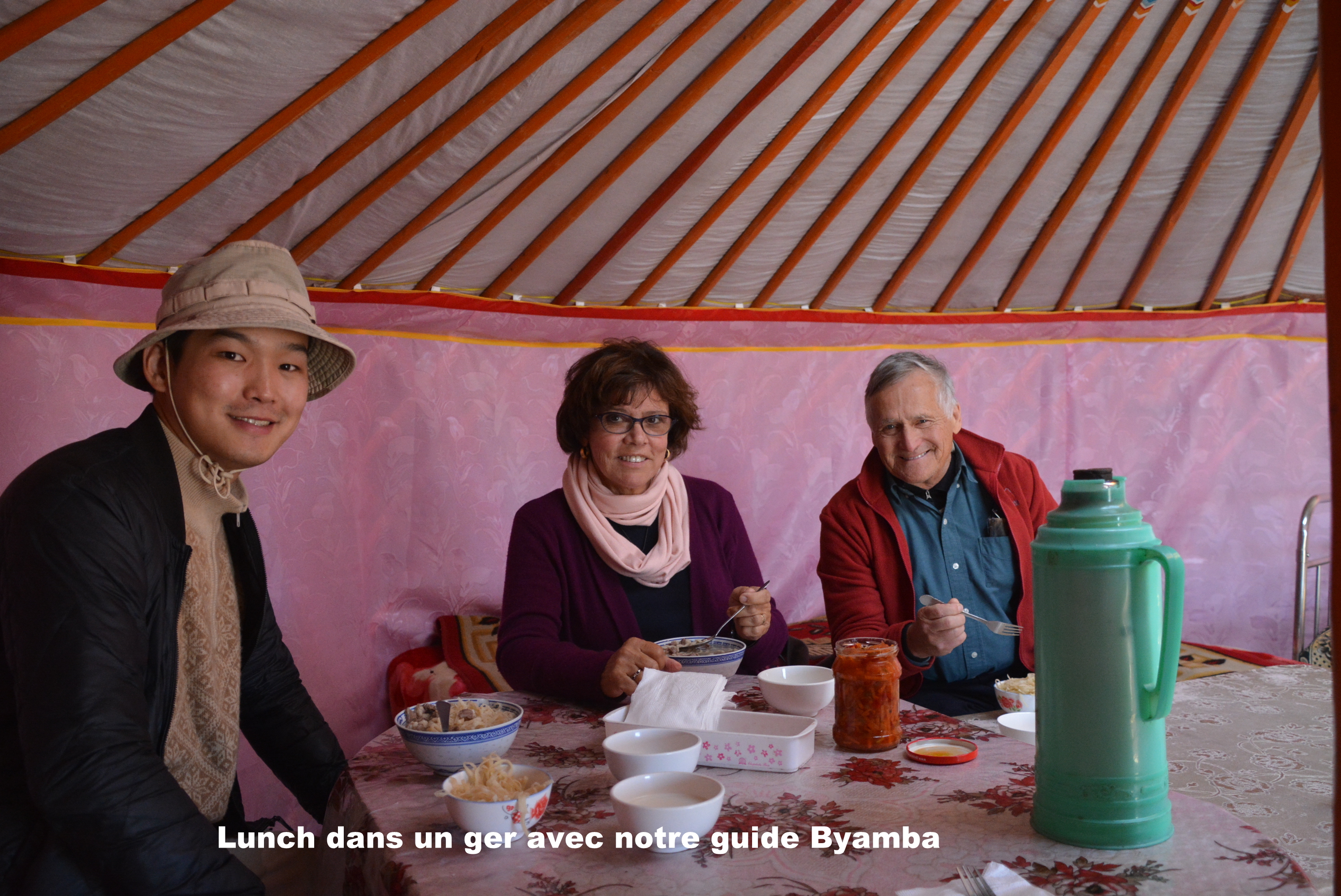 Pour les détails pratiques, nous avions fait appel à l’agence Travel Buddies et il nous en a coûté 1216$US pour les deux pour cette excursion (nous étions seuls avec un guide et un chauffeur), plus un supplément de 300$US car nous avions opté pour coucher dans des gers avec toilette et douche, plutôt que devoir marcher 100 mètres et plus dans la nuit glaciale pour nos petits pipis. Avec les températures très basses que nous avons connues, nous n’avons pas regretté ce rare luxe que nous nous sommes offerts. Et ce fût, surtout grâce à la compétence, la gentillesse et la chaleur de notre jeune guide Byamba et de notre chauffeur Moodi, une excursion mémorable, extraordinaire, dont nous avons adoré chaque instant.