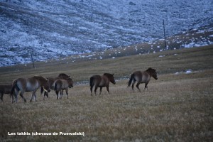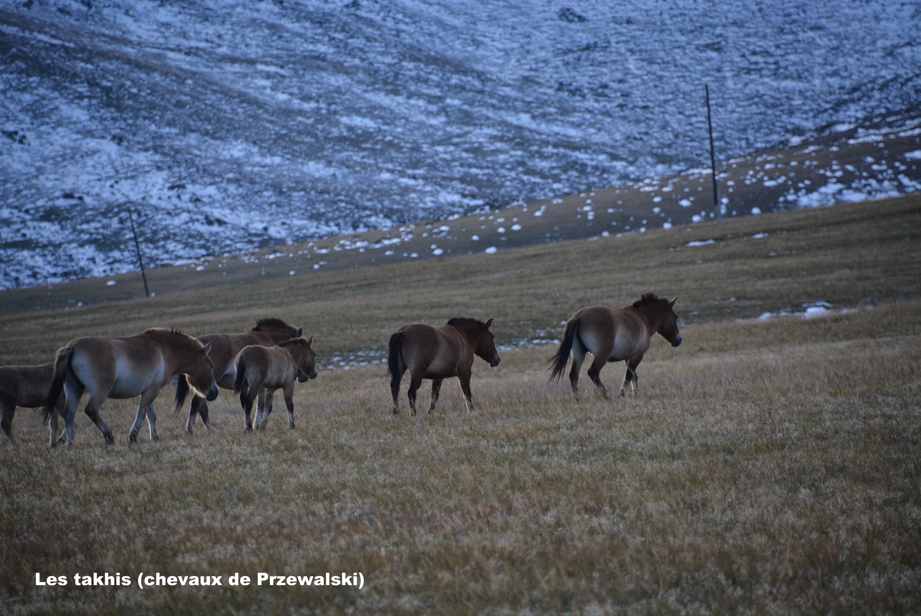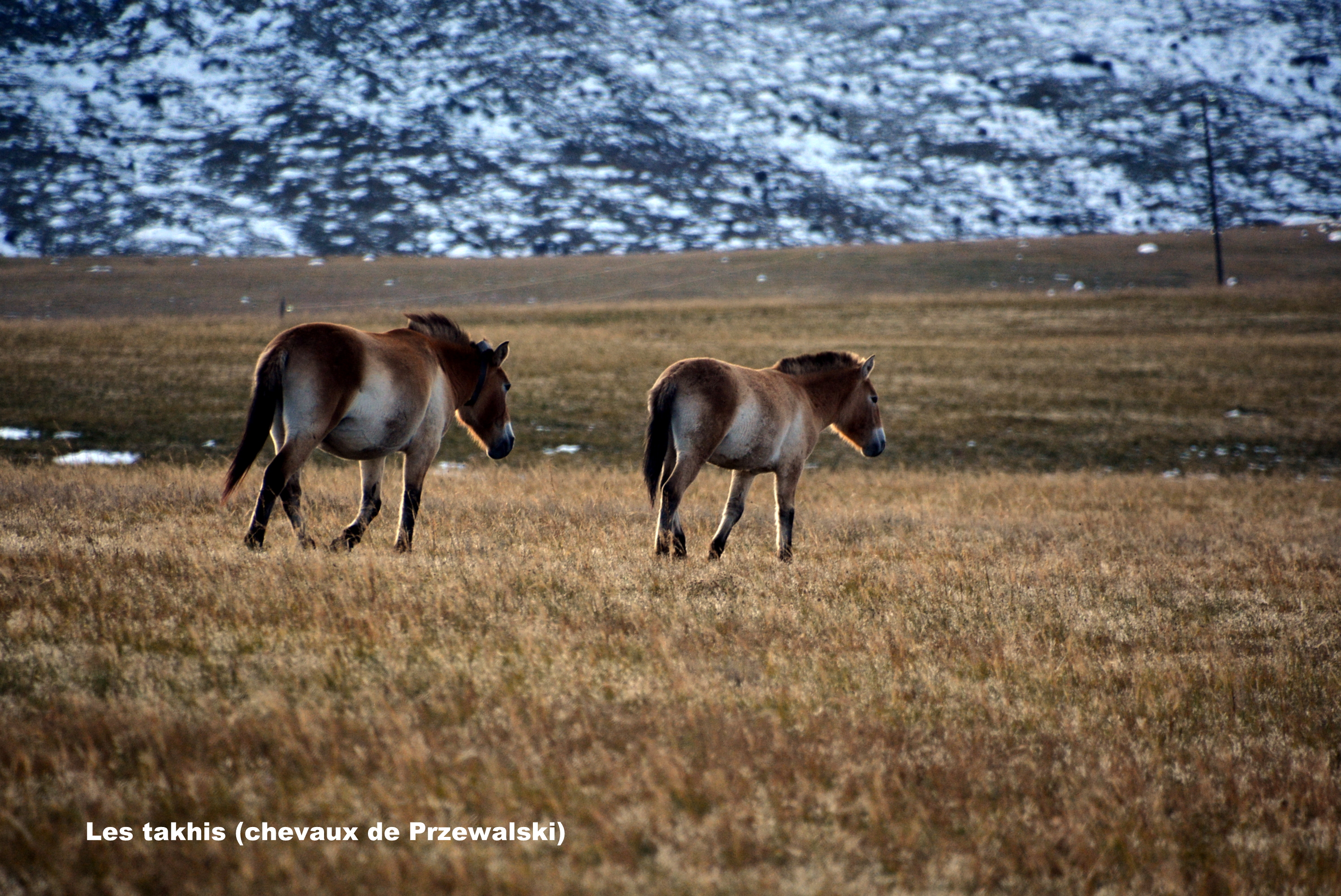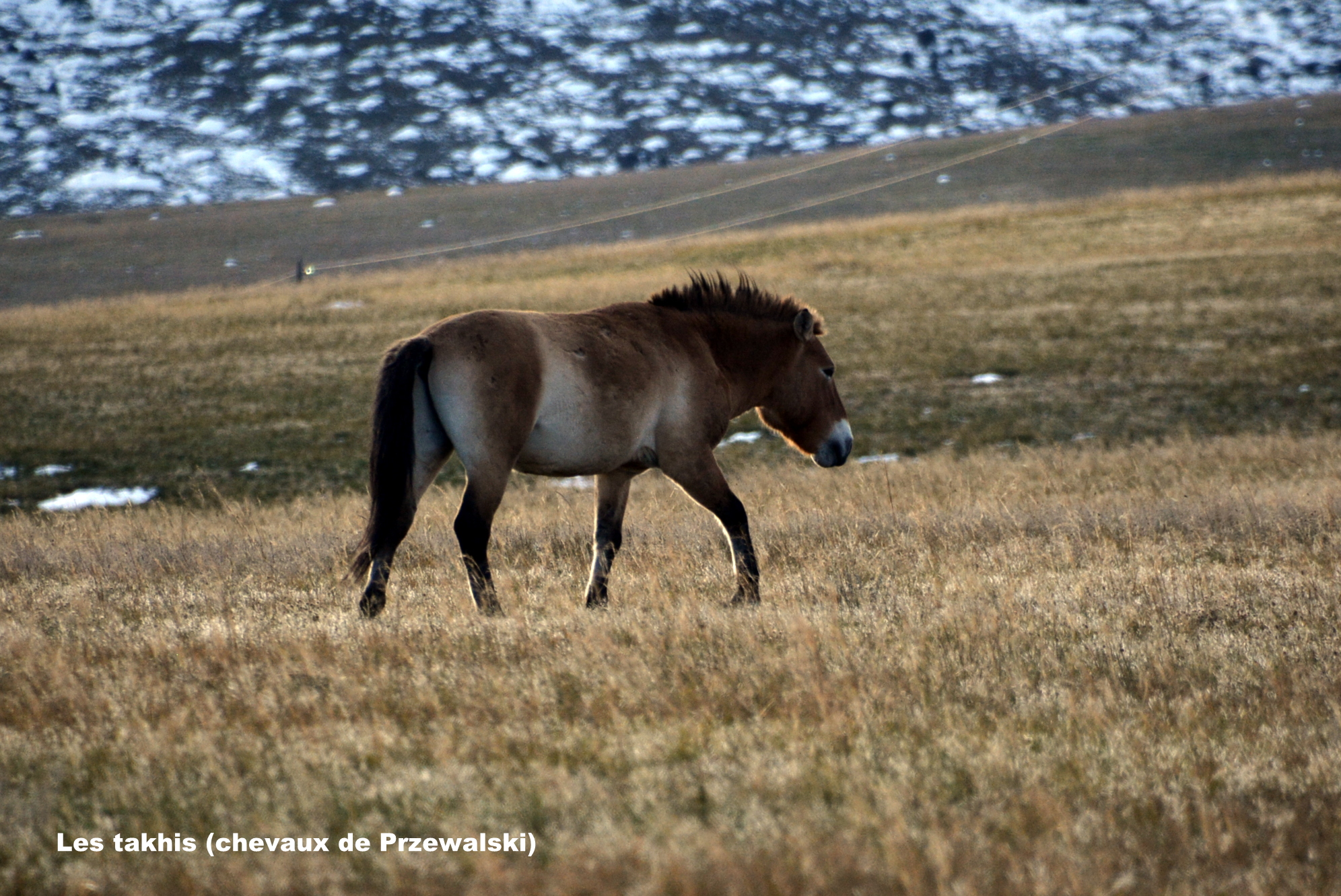 chevaux de Przewalski (ou takhis en mongol) dont le dernier individu a disparu de Mongolie dans les années 1960, mais qui ont été réintroduits avec succès à partir de spécimesn qui se trouvaient dans différents zoos d’Europe.