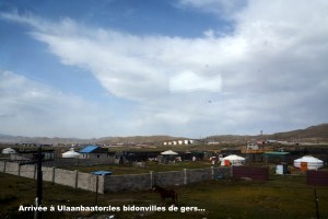 bidonvilles de gers (yourtes, mais « ger », qui vient du russe, est maintenant le terme utilisé en Mongolie) entourent Ulaanbaator. Et lorsqu’on pense à l’hiver, à la pollution et à la boue des environs d’Ulaanbaator, c’est triste. Les gers sont l’habitation commune en Mongolie (sauf en ville), et leurs propriétaires peuvent les déménager très aisément avec une simple camionnette; les terrains appartiennent à l’état, mais on peut y installer partout son ger à condition que ce ne soit pas de façon permanente.