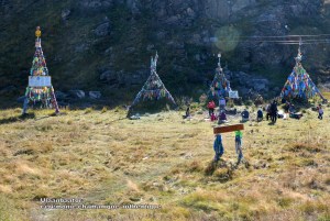 et nous incite à sortir. Lui et Byamba nous entraînent vers une clôture grillagée de l‘autre côté de la route. Sur le terrain adjacent s’y déroule une cérémonie chamanique que nous pouvons observer et photographier de loin, cachés en partie par des arbustes. Ce n’est pas une cérémonie pour les touristes, mais pour des