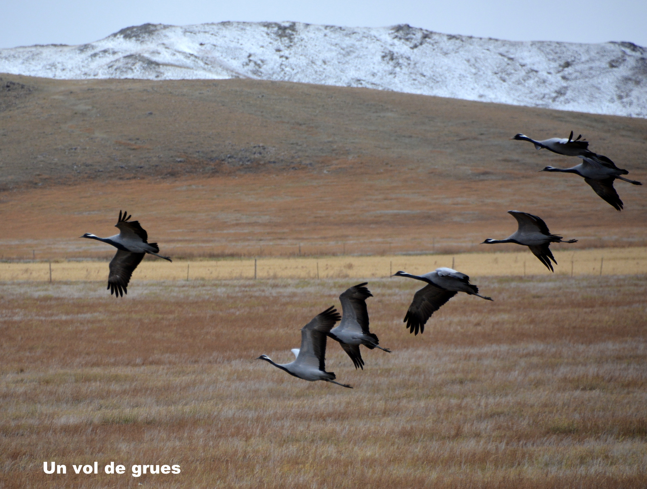 n’avions pas apporté nos vêtements d’hiver, mais de bons vêtements d’automne enfilés par-dessus des sous-vêtements de ski : on a survécu. Nous avons eu la chance d’observer pendant un bon moment un vol de superbes grues demoiselles. Après un