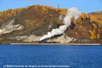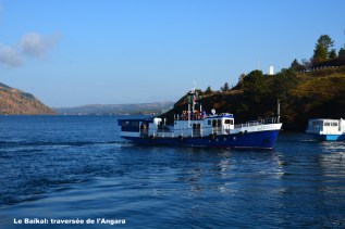 sans l’ombre d’un bâtiment ou d’une structure. C’est pourtant de là que nous prenons un traversier, en jouant presqu’aux funambules sur un madrier qui sert de passerelle de la terre ferme jusqu’au petit navire. Mais que le paysage est grandiose avec ses couleurs automnales et la température fort agréable. Sur l’autre rive, à Port Baïkal, nous voyons arriver la locomotive à vapeur qui tirera nos wagons pendant les prochaines heures.
