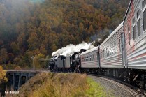 quand même admirer la rive opposée et ses hautes montagnes que nous n’avions pas pu apercevoir lors de notre trajet d’Ulaanbaator à cause du mauvais temps. Le temps de changer notre locomotive à vapeur pour une électrique à Sloudianka, et nous reprenons les rails vers Irkoutsk alors que la pluie se met de la partie. Mais quelle magnifique excursion !