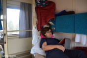 arrêt. J’avais les valises, et Marie cherchait notre wagon avec nos tickets en main; mais nous nous sommes perdus de vue, et pour ma part je cherchais en vain le numéro du wagon en courant sur le quai avec ces valises et mon poignet amoché, qui en a justement profité pour devenir particulièrement douloureux, et sans mon billet qui m’aurait permis de monter dans un wagon. Mais Marie avait rejoint le wagon, et notre gentille et imposante provodnitsa l’a rassurée, le train ne pouvant partir tant qu’elle resterait sur le quai. Lorsque notre provodnitsa m’a vu approcher, elle a empoigné d’une main ferme la plus grosse de mes valises, libérant ainsi mon poignet qui me faisait maintenant atrocement souffrir; je l’aurais embrassée (mais je n’ai pas osé!). Je dois dire qu’elle a été gentille et d’une aide précieuse pendant tout ce voyage, même si son anglais était à peu près inexistant.